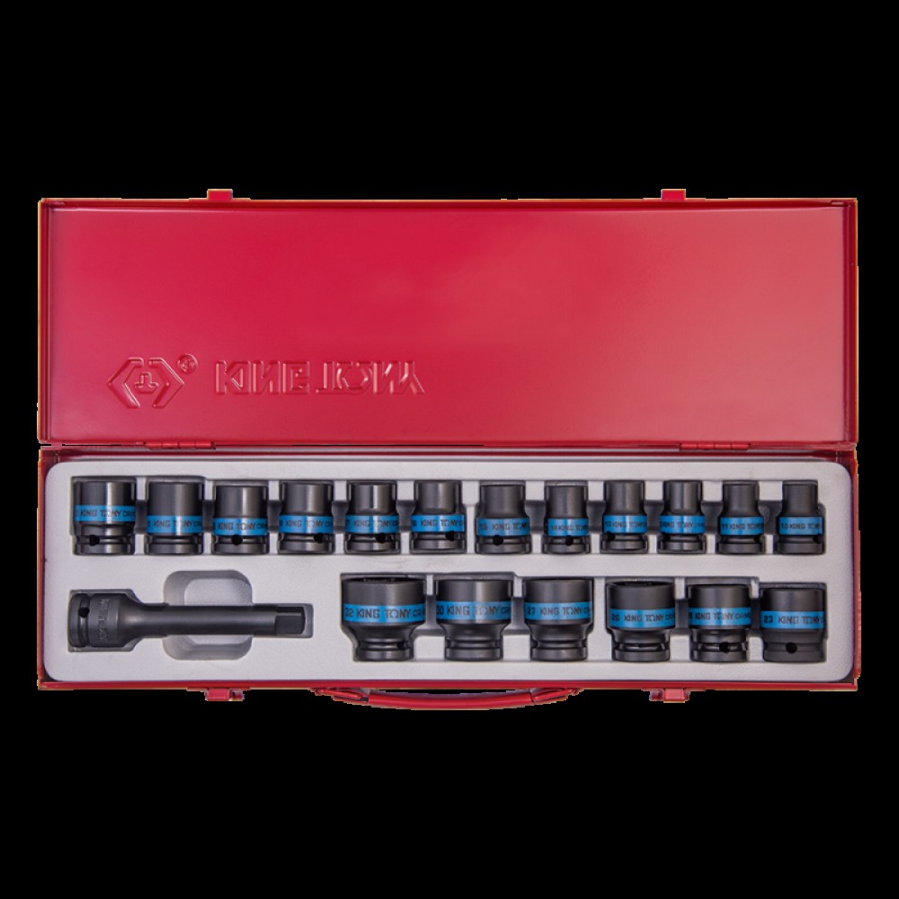Призначення: Комплект ударних торцевих головок для проведення слюсарно-монтажних робіт з механічним приводом ударної дії високонавантаженими або ускладненими різьбовими з'єднаннями. Галузь застосування: Станції технічного обслуговування (СТО), автосервіси, автомайстерні. Комплектація: Торцеві головки KING TONY розміри: 10, 11, 12, 13, 14, 15, 16, 17, 18, 19, 21, 22, 23, 24, 26, 27, 30, 32 мм. Подовжувач 1/2" 125 мм.
