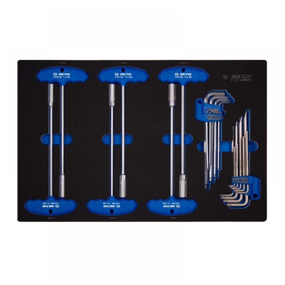 Набір ключів комбінований KING TONY (24 шт.) (9-22124MRV50) Комплектація: Ключі торцеві з Т-подібною ручкою H7, H8, H10, H11, H12, H13 Ключ кутові шестигранні з кульовим закінченням H1.5, H2, H2.5, H3, H4, H5, H6, H8, H10 Ключі кутові TORX з отвором T10H, T15H, T20H, T25H, T27H, T30H, T40H, T45H, T50H Поставляється у ложементі