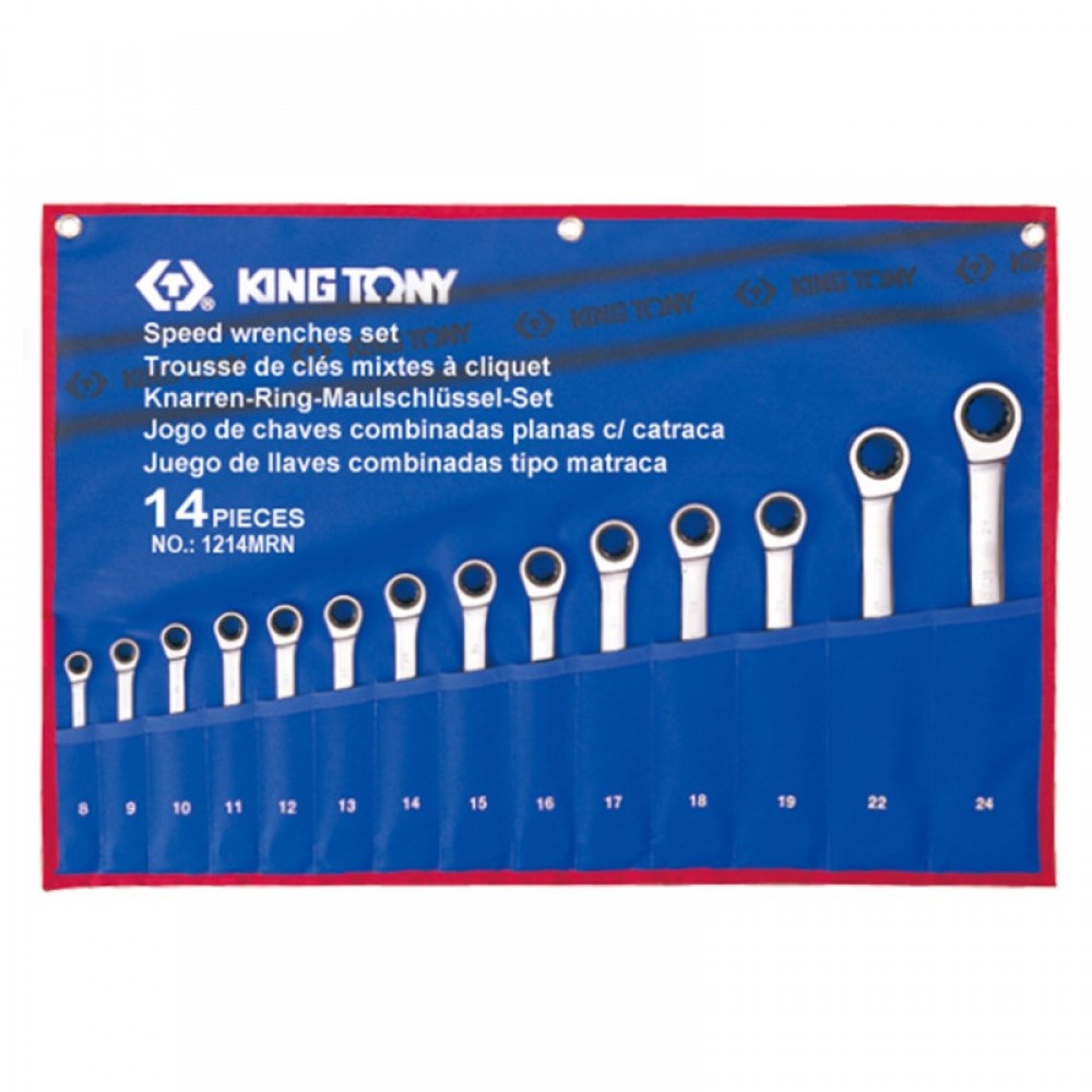 Ключі комбі з тріскачкою 3731М (8, 9, 10, 11, 12, 13, 14, 15, 16, 17, 18, 19, 22, 24) Набір ключів комбі з тріскачкою 14шт. (8-24) – професійний ручний інструмент для роботи з різьбовими з'єднаннями із зовнішнім профілем. Ключі призначені для автосервісу, будівництва та промислових підприємств. Рожковий і накидний з тріскачкою ключ – найкраща комбінація для обслуговування вузлів та механізмів автомобіля. Ручний інструмент з тріскачкою оптимізує робочий процес, скорочуючи час виконання завдання. У храпового механізму тріскачки 72 зубці з кутом для подальшого клацання 5 градусів. Рішення ідеально підходить для роботи в важкодоступних місцях, але не дозволяє ударні навантаження або нарощування крутного моменту для зриву різьби, що прикипіла. Накидна головка має 12-гранний профіль, який дозволяє працювати і 6-гранними елементами кріплення. Набір ключів комбі з тріскачкою виготовлений з легованої сталі з додаванням ванадію та хрому. Ручний інструмент у заводських умовах отриманий методом гарячого кування з подальшою термообробкою. Висока стійкість до навантажень та деформації – переваги ключів King Tony. Для зручності зберігання та транспортування інструмент комплектується щільним чохлом, який легко складається або вивішується на стіну.