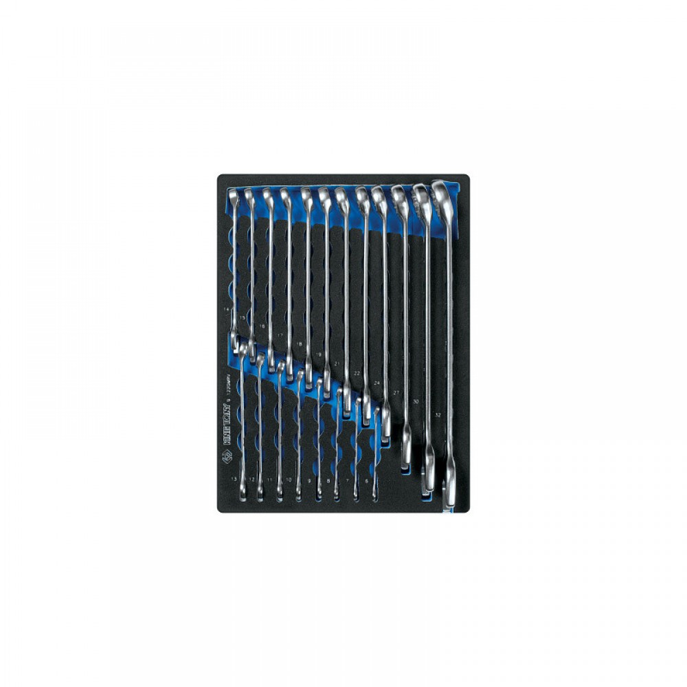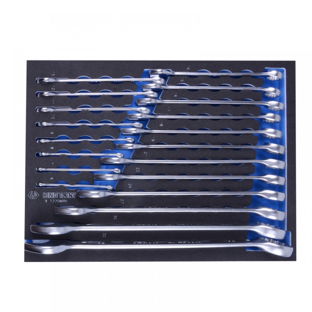 Набір комбінованих ключів торгової марки KING TONY призначений для монтажу та демонтажу вузлів кріплення різних виробів, пристроїв і агрегатів. Матеріал ложемента - EVA (ЕВА, етиленвінілацетат). При своїй легкості, цей матеріал володіє високими характеристиками міцності, стійкістю до масел і розчинників, при деформації повертає колишню форму. Виготовлений спеціально для комплектації інструментального візка. Склад набору Ключі комбіновані серії 1060 6, 7, 8, 9, 10, 11, 12, 13, 14, 15, 16, 17, 18, 19, 21, 22, 24, 27, 30, 32 мм