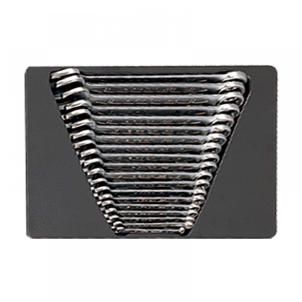 Лоток категорії №4 (375 х 265 мм) Ключі серії 1060 розмірами: 6, 7, 8, 9, 10, 11, 12, 13, 14, 15, 16, 17, 18, 19, 20, 21, 22, 23, Ключі комбіновані серії 1060 найбільш універсальні і застосовуються для виконання будь-яких видів робіт з кріпленням - як вдома, в гаражі, в автослюсарній майстерні, станції технічного обслуговування авто, мото та іншої техніки, так і на виробництві. особливості: • Спеціальний вигин 15° дозволить працювати у місцях з обмеженим доступом до кріплення; • Накидна та ріжкова частини допоможуть підібратися до кріплення як з торця, так і з боку, залежно від місця виконуваних робіт; • 12-тигранний профіль накидної частини універсальний у роботі з головками болтів або гайками як 6-ти, так і 12-тигранного профілю.