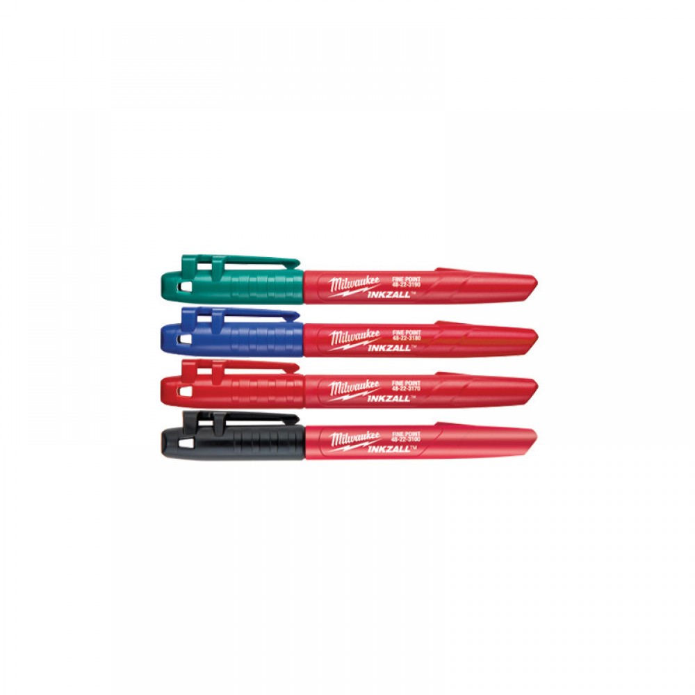 Маркер INKZALL Набір (Синій/Червоний/Зелений/Чорний) особливості: Міцне акрилове перо ідеально підходить для таких грубих поверхонь, як ОСП та бетон. Крім того, він підходить для розмітки дерев'яних, металевих, пластикових та керамічних поверхонь. Акрилове перо залишається гострим протягом тривалого часу, не розтріпується і не відходить при натисканні. Швидке висихання чорнила знижує ймовірність розмазування. Однак самі маркери INKZALL зі знятим ковпачком висихають вкрай повільно (не висихає без ковпачка понад 72 години). Протиковзка конструкція корпусу. Скоба для каски на ковпачку маркера INKZALL дозволяє прикріпити маркер до касці, штанів, спецодягу і т.д. Отвір для ремінця, наприклад, для кріплення маркерів INKZALL на ремінь або маркера-стилуса INKZALL до сенсорного пристрою. Нетоксичне чорнило, що відповідає стандарту ASTM D 4236. Маркери-стилуси INKZALL з тонким акриловим пером - єдині маркери на ринку, які можна використовувати як стілус!