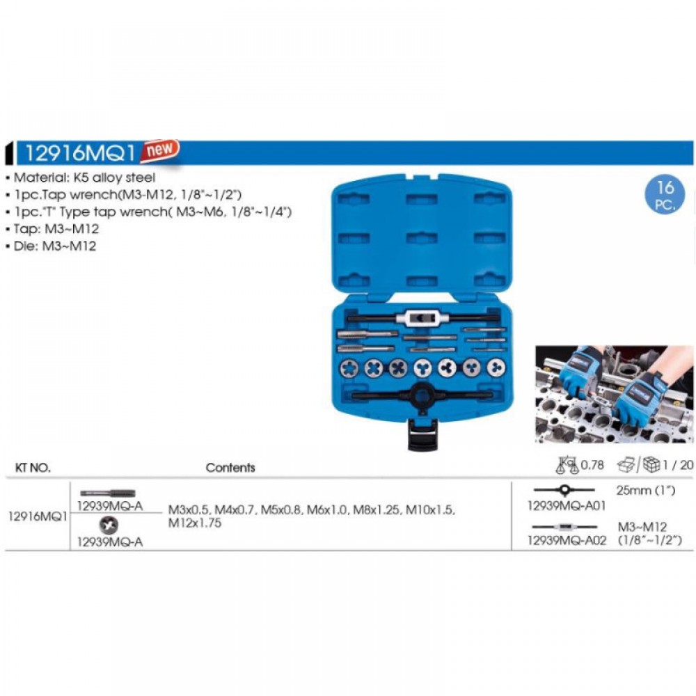 Набір мітчиків та плашок метричних KING TONY 12916MQ1 16 предметів професійний інструмент, служить для нарізування як зовнішнього, так і внутрішнього різьблення. Комплектуючі набори відповідають найвищим стандартам якості. Набір задовольнить потреби найвибагливішого майстра в автосервісній майстерні або станції технічного обслуговування. Виробляється на о. Тайвань Комплектація: Мітчики: М3-0.5; М3-0.6; М4-0.7; М5-0.8; М5-0.9; М6-1.0; М8-1.25; М10-1.5; М12-1.75 Плашки: М3-0.5; М4-0.7; М5-0.8; М6-1.0; М8-1.25; М10-1.5; М12-1.75 Утримувач Різьбомір