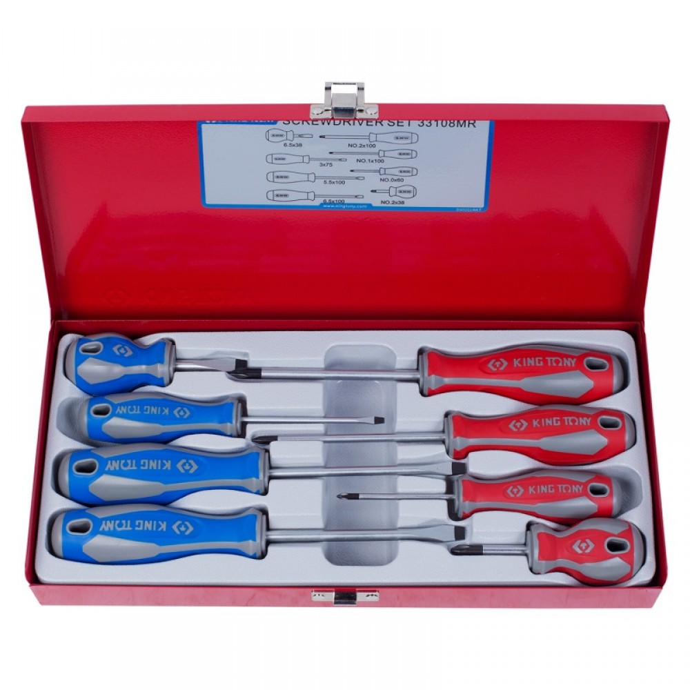 Набір викруток 8 од. KINGTONY 33108MR Викрутка (+): PH0 x 60, PH1 x 100, PH2 x 100, PH2 x 38 Викрутка (-): 3 x 75, 5.5 x 100, 6.5 x 38, 6.5 x 100 Набір викруток KING TONY 33108MR призначений для монтажу та демонтажу вузлів кріплення різних виробів, пристроїв і агрегатів. Особливості набору • Високоточна обробка намагнічених наконечників дає ідеальний контакт із кріпленням. • Ергономічні двокомпонентні рукоятки PP+TPR стійкі до дії масел, бензину, кислот та лугів. • Матеріал робочої частини викруток SNCM+V – легована сталь із додаванням молібдену, покриття хром.