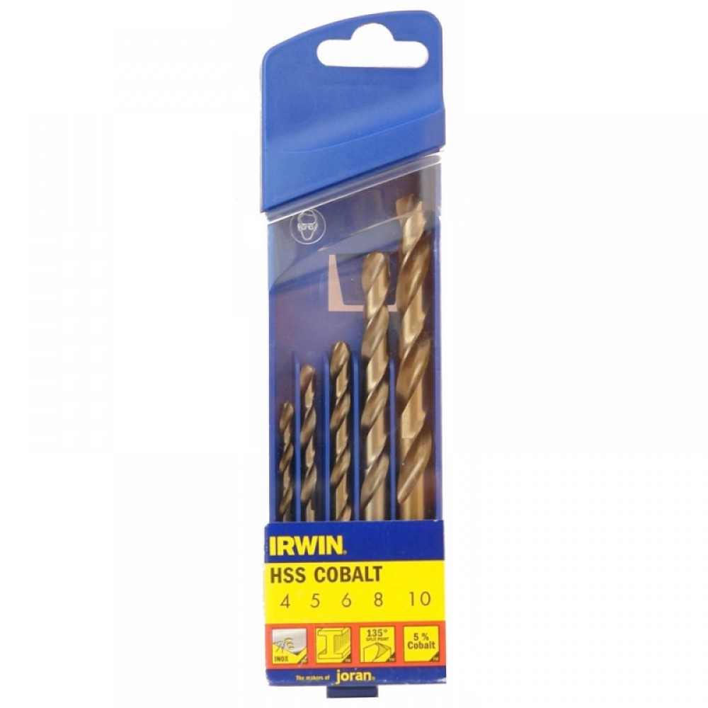 Набір свердел по металу HSS COBALT 5 шт., IRWIN Виготовлено за стандартом DIN 338. Ідеальний для свердління нержавіючої сталі. Відшліфована ріжуча кромка під кутом 135° гарантує чудове самоцентрування та зменшує навантаження під час свердління. Опір високим температурам, покращена зносостійкість завдяки додаванню 5% кобальту.