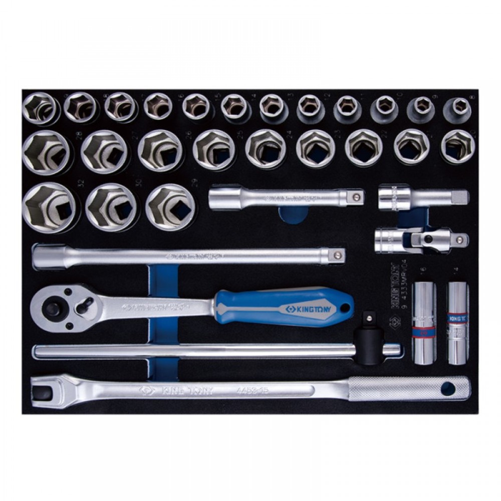 Вигідно купити набір інструментів: головки, тріскачка, комірки Кінг Тоні Комплект інструменту орієнтований на професіоналів. Постачається набір із ложементів EVA, під висувний лоток системи зберігання розміром 375х280 мм. Можна встановлювати в ящики мобільних тумб розміром до 579х380 мм. У комплектацію входять: · Головки торцеві, звичайні, метричні, 6-гранні: 8-32 мм.· Тріскачка 1/2" з прапорцевим перемикачем, гумова рукоять - 4771-10GR.· Вороток з плаваючою головкою 1/2" - 4572-12.· Вороток з карданом 1/2" - 4453-15F.· Подовжувачі для торцевих головок 1/2" (4251-03R, 4251-05R, 4251-10R).· Кардан 4791R (посадковий квадрат 1/2").· Головки свічкові 463014RC та 463016RC, 12-гранні. Матеріал виготовлення головок та інструменту – хромованадієва сталь, оздоблення – хромування.