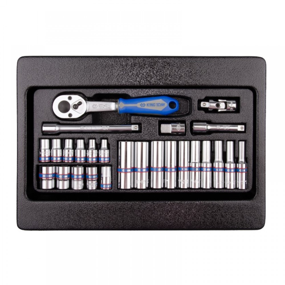 Комплект торцевих головок у ложементі 1/4" 6гранн. 26 ін. Склад набору - Головка торцева стандартна 6гран. 1/4", 2335M (4, 4.5, 5, 5.5, 6, 7, 8, 9, 10, 11, 13) - Головка торцева глибока 6гранн 1/4", 2235M (4, 5, 5.5, 6, 7, 8, 9, 10, 11, 13) - Подовжувач 2221-04 1/4", (100 мм) - Подовжувач 2221-02 1/4", (50 мм) - Перехідник 2813 1/4" на 3/8" - Кардан 2792 1/4" - Тріскачка 2779-55G 1/4", 140 мм, 24 зуб, прапорцева, фіксатор