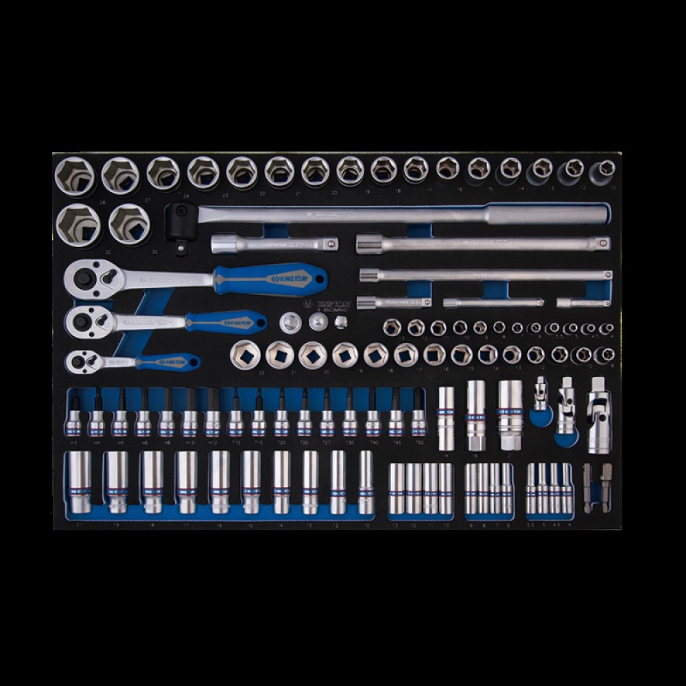 Головки та приладдя 1/2" Головки торцеві стандартні 6-гранні 4335M 10, 12, 13, 14, 15, 16,17, 18, 19, 20, 21, 22, 23, 24, 27, 28, 30, 32 мм Тріскачка прапорцева 4771-10GR 250 мм, 32 зубці Вороток із шарніром 4462-18F 450 мм Подовжувачі 4251 125, 250 мм Кардан 4791R 77,5 мм Перехідник 1/2" > 3/8" 4813 34 мм Головки та приладдя 3/8" Головки торцеві стандартні 6-гранні 3335M 8, 10, 11, 12, 13, 14, 15, 16, 17, 18, 19, 20, 21, 22 мм Головки торцеві глибокі 6-гранні 3235M 10, 12, 13, 14, 15, 16, 17, 18, 19, 21 мм Головки свічкові 6-гранні, гумовий фіксатор 3635 16, 21 мм Головка свічкова 12-гранна, пружинний фіксатор 36A014 14 мм Тріскачка прапорцева 3771-08G 200 мм, 32 зубці Подовжувачі 3221 75, 250 мм Кардан 3792 56.5 мм Перехідник 3/8" > 1/4" 3812 26 мм Головки та приладдя 1/4" Головки торцеві стандартні 6-гранні 2335M 4, 4.5, 5, 5.5, 6, 7, 8, 9, 10, 11, 12, 13 мм Головки торцеві глибокі 6-гранні 2235M 4, 4.5, 5, 5.5, 6, 7, 8, 9, 10, 11, 12, 13 мм Тріскачка прапорцева 2771-55G 140 мм, 24 зубці Подовжувач 2221 50, 100 мм Кардан 2792 36 мм Перехідник 1/4" > 3/8" 2813 26 мм Насадки торцеві 3/8" Насадки торцеві HEX 3025 H3, H4, H5, H6, H8, H10, H12 Насадки торцеві TORX 3023 T10, T15, T20, T25, T27, T30, T40, T45, T50 Інший інструмент Перехідник 3/8" > HEX 1/4" 7703-50 50 мм Перехідник 1/4" > HEX 1/4" 7702-50 50 мм Матеріали: сталь Cr-V, хром, гума TPR, EVA (ложемент), пластик ABS Розмір ложементу: 560 x 375 мм Вага: 7.30 кг Призначення Передача крутного моменту від інструменту на кріплення, монтаж/демонтаж посаджених гайок та болтів. Галузь застосування Станції технічного обслуговування (СТО), автосервіси, автомайстерні, виробництво, побутове застосування. Особливості Розмір ложементу адаптований для розміщення на полиці інструментального візка. Матеріал ложемента - EVA - легкий, міцний, еластичний і пружний матеріал, що володіє хорошими властивостями, що амортизують, стійкий до олій і розчинників, при деформації повертає колишню форму. EVA (ЕВА, полімер на основі етилену та вінілацетату) – матеріал, що не має рівних за своїми характеристиками та задовольняє умов інтенсивної експлуатації в умовах щоденної роботи. Інструмент KING TONY • Виготовлений із високоміцної легованої хром-ванадієвої інструментальної сталі; • Хромоване покриття захищає інструмент від корозії; • Ергономічні ручки інструментів, стійкі до дії масел, бензину, кислот та лугів; • Для надання торцевим головкам особливої міцності, в процесі виготовлення застосовано метод кування, що надає інструментам особливої міцності. Якість Відповідає вимогам міжнародного стандарту DIN 3124, ISO 2725-1.