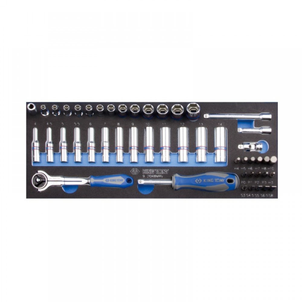 Набір інструментів KING TONY 9-2548MRV, 48 шт. У набір входить: Головки торцеві 6-гранні стандартні 4, 4.5, 5, 5.5, 6, 7, 8, 9, 10, 11, 12, 13, 14 мм Головки торцеві 6-гранні глибокі 4, 4.5, 5, 5.5, 6, 7, 8, 9, 10, 11, 12, 13, 14 мм Тріскачка дискова 150 мм, 24 зубці Подовжувачі 50, 100 мм Вороток-викрутка 150 мм Утримувач вставок (біт) 1/4” Кардан 36 мм Біти шліцеві Slotted 3, 4.5, 5, 6.5, 8 мм Біти хрестові Phillips PH0, PH1, PH2, PH3 Біти шестигранні HEX H3, H4, H5, H6, H7, H8, H10