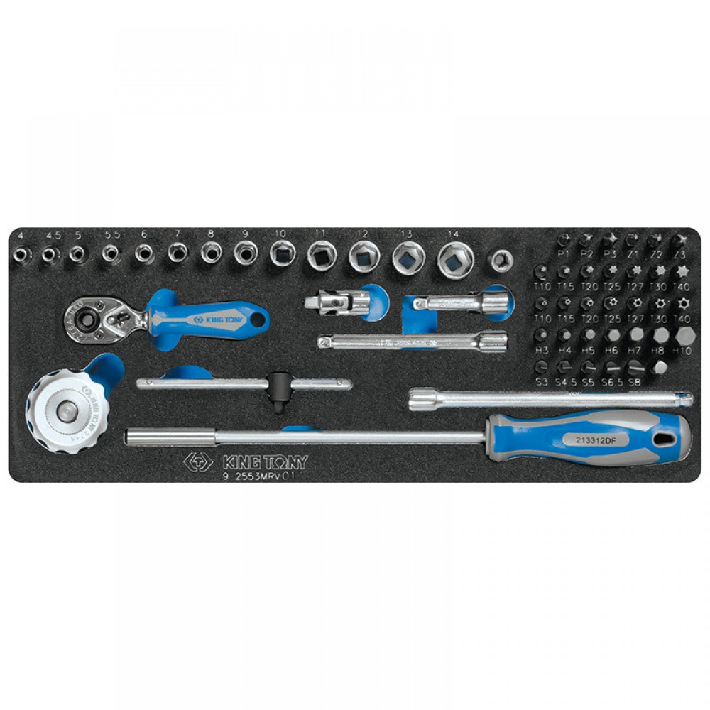 Набір торцевих головок 1/4" з приладдям, ложемент, 55 предметів Комплектація Головки та приладдя 1/4" Головки короткі 6-гранні 2335M 4, 4.5, 5, 5.5, 6, 7, 8, 9, 10, 11, 12, 13, 14 мм Тріскачка прапорцева для головок та вставок (біт) 276A-04G 72 зубця, 108 мм Тріскачка безкрокова для вставок (біт) 2745 дисковий механізм, D=46 мм, H=26.5 мм Викрутка-вороток для вставок (біт) 213312DF 300 мм Перехідник-вставка для головок 7702-25 25 мм Вороток ковзний 2571-45 115 мм Подовжувачі 2221 50, 100, 150 мм Кардан 2792 36 мм Тримач вставок (біт) 1/4" 2142 25 мм Вставки (біти) 1/4" (6,35 мм) HEX 1025H H3, H4, H5, H6, H7, H8, H10 TORX 1025T T10, T15, T20, T25, T27, T30, T40 TORX TR (з отвором) 1025U T10H, T15H, T20H, T25H, T27H, T30H, T40H PHILLIPS 1025P PH1, PH2, PH3 POZIDRIV 1025Z PZ1, PZ2, PZ3 SLOTTED 1025S 3, 4.5, 5, 6.5, 8 Кількість предметів: 65 Матеріали: сталь Cr-V, PP+TPR (рукоятки), хром, сталь, етиленвінілацетат (EVA) Розміри: 375 x 140 x 50 мм Упаковка: коробка картон Вага: 0,97 кг Призначення Передача крутного моменту від інструменту на кріплення, монтаж/демонтаж посаджених гайок та болтів. Особливості Розмір ложемента адаптований як для мобільного використання (футляр поставляється окремо), так і для стаціонарного розміщення на полиці інструментального візка (ложемент). Матеріал ложемента EVA – легкий, міцний, еластичний та пружний матеріал, що має хороші амортизуючі властивості, стійкий до олій та розчинників, при деформації повертає колишню форму. EVA (ЕВА, полімер на основі етилену та вінілацетату) – матеріал, що не має рівних за своїми характеристиками та задовольняє умов інтенсивної експлуатації в умовах щоденної роботи. Інструмент KING TONY • Виготовлений із високоміцної легованої хром-ванадієвої інструментальної сталі; • Хромоване покриття захищає інструмент від корозії; • Ергономічні ручки інструментів, стійкі до дії масел, бензину, кислот та лугів; • Для надання торцевим головкам особливої міцності, в процесі виготовлення застосовано метод кування, що надає інструментам особливої міцності.
