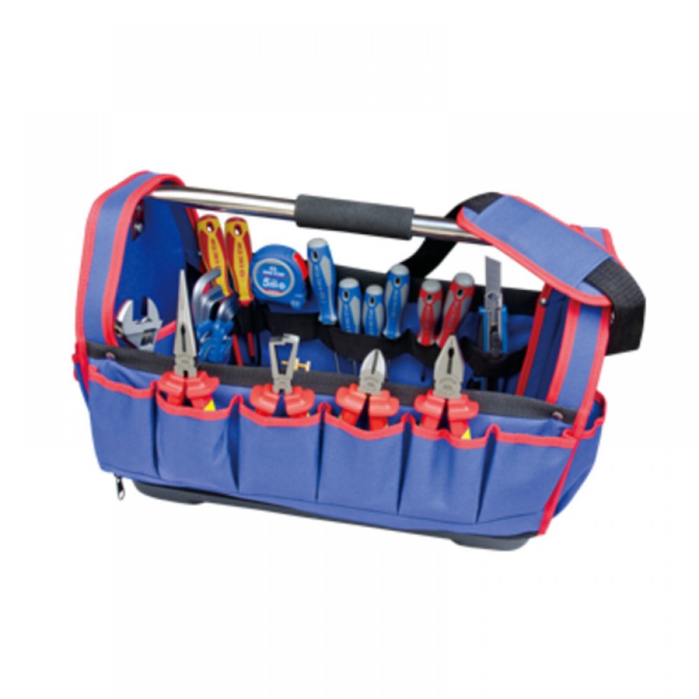 Набір інструментів для електрика 33 Предмета Набір інструментів для електрика з 33 предметами – призначений для побутового та професійного використання. Виробник King Tony підібрав асортименти так, щоб майбутній власник, не втративши мобільності, мав під рукою необхідний ручний інструмент для роботи з електричним обладнанням. У наборі із 33 предметів покупець знайде масу корисних інструментів. Електромонтажні кусачки з прогумованими рукоятками убезпечать власника під час обслуговування високовольтної мережі. Пасатижі – універсальний інструмент, який замінить десятки накидних ключів та допоміжних аксесуарів. Електрику не впорається без викруток. Замість змінних біт бренд King Tony пропонує набір інструментів для роботи з різьбовими з'єднаннями різних форм і розмірів. Пара викруток має індикатор струму. Набір торцевих ключів стане в нагоді автомеханіку, що працює з електропроводкою транспорту в важкодоступних місцях. Багатоцільовий інструмент – розсувний ключ, допоможе вирішити проблему з відсутніми в наборі насадками, а також послужить як додатковий затиск. Монтажний ніж з ріжучою кромкою, що оновлюється, і п'ятиметрова рулетка – приємне доповнення до набору з 33 предметів, яке порадує покупця. Викрутки Хрестові PHILLIPS 1421 PH1x80, PH2x100 Шлицеві SLOTTED 1422 5x75, 5x100, 6.5x100, 6.5x150 Хрестові PHILLIPS діелектричні 1471 PH2x100 Шлицеві SLOTTED діелектричні 1472 6.5x150 Набір шестигранників L-типу з кульовим закінченням 20109MR H1.5, H2, H2.5, H3, H4, H5, H6, H8, H10 Набір шестигранників L-типу з кульовим закінченням 20129SR 1/16", 3/32", 1/8", 5/32", 3/16", 1/4", 5/16", 3/8", 5 /64" Шарнірно-губцевий інструмент Пасатижі комбіновані діелектричні 6116-07A 185 мм Бокорізи діелектричні 6216-06A 167 мм Пасатижі тонконосі діелектричні 6318-08A 210 мм Ножиці електрика для роботи з проводами 6AB12-55 145 мм Пасатижі для зачистки ізоляції діелектричні 6716-06A 160 мм Допоміжний інструмент Ключ розвідний хром 3611-08R 200 мм Рулетка 19 мм 79093-05C 5 м Ніж зі змінними лезами 18 мм 7971-07 165 мм Сумка для інструментів Матеріал – нейлон 1200D 87711C 550 х 285 х 370 мм Кількість предметів: 33 Матеріали: сталь Cr-V, PP+TPR (рукоятки), хром, нейлон Упаковка: коробка картон Габарити упаковки: 550 х 285 х 370 мм Вага: 6,02 кг Особливості Сумка виготовлена з водонепроникного нейлону 1200D, має 39 кишень, внутрішній жорсткий каркас, лите дно із пластику PP, металеву штангу з нержавіючої сталі та регульований плечовий ремінь. Призначення Електромонтажні та інші види робіт. Галузь застосування Станції технічного обслуговування (СТО), автосервіси, автомайстерні, виробництво, побутове застосування.