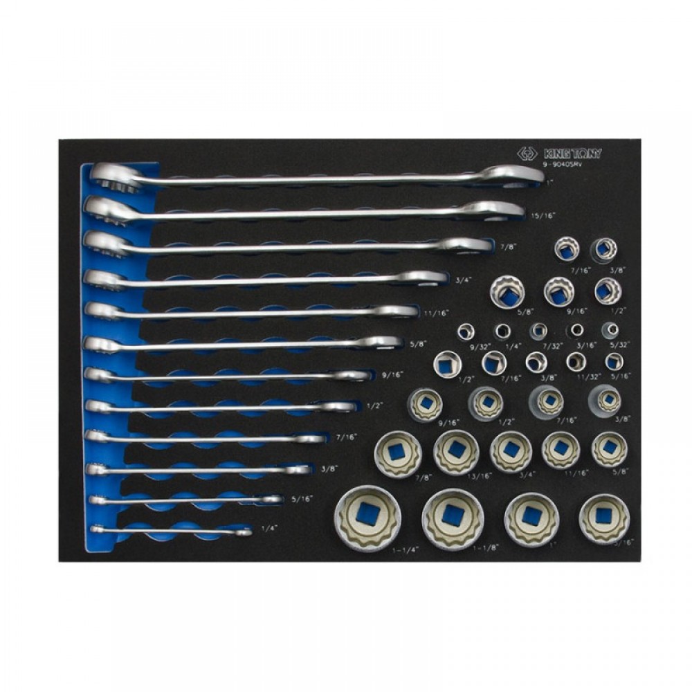 Набір торцевих головок та ключів комбінованих дюймових KING TONY EVA FOAM, 40 предметів (9-9040SRV) особливості: Застосовуються для закручування та відкручування гайок та болтів з шестигранною та дванадцятигранною головкою Виготовлені з хромованадієвої сталі Покриті хромом, який захищає інструменти від корозії. Висока якість матеріалів Тривалий термін служби Комплектація: Торцеві головки 12PT 1/2"DR 3/8", 7/16", 1/2", 9/16", 5/8", 11/16", 3/4", 13/16", 7/ 8", 15/16", 1", 1-1/8", 1-1/4" Торцеві головки 1/4"DR 5/32", 3/16", 7/32", 1/4", 9/32", 5/16", 11/32", 3/8", 7/16 ", 1/2" Торцеві головки 12PT 3/8"DR 3/8", 7/16", 1/2", 9/16", 5/8" Ключі комбіновані 1/4", 5/16", 3/8", 7/16", 1/2", 9/16", 5/8", 11/16", 3/4", 7/8 ", 15/16", 1" Поставляється у ложементі