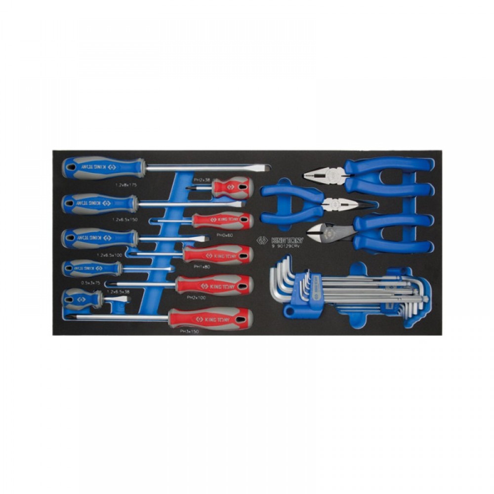 Набір інструментів KING TONY 9-90129CRV, 29 предметів (9-90129CRV). У набір входить: Ключ кутовий шестигранний з кульовим закінченням 1.5, 2, 2.5, 3, 4, 5, 6, 8, 10 мм Ключ кутовий шестигранний із кульовим закінченням 3/32, 1/8, 5/32, 3/16, 1/4, 5/16, 3/8 Викрутки PH0 x 60, PH1 x 80, PH2 x 38, PH2 x 100, PH3 x 150 Викрутки SL3 x 75, SL6.5 x 38, SL6.5 x 100, SL6.5 x 150, SL8 x 175 Пасатижі 6111-07 Бокорізи 6231-07 Довгогубці 6311-06