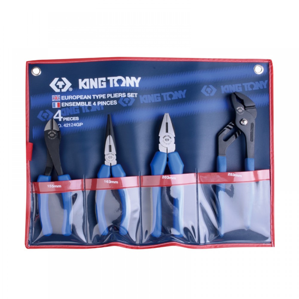 Набір інструментів 4 од. (200мм кусачки, пасатижі, пасатижі удл., кобра) (європ. тип) KINGTONY 42124GP Представлений набір від тайванського виробника включає кліщі, плоскогубці, довгогубці та бокорізи. Їх ріжуча частина виконана із міцної та надійної сталі. Постачання виконується у зручному для зберігання чохлі. Комплектація: - переставні кліщі, 253 мм; - Плоскогубці, 213 мм; - довгогубці, 200 мм; - Бокорізи, 200 мм; - Чохол