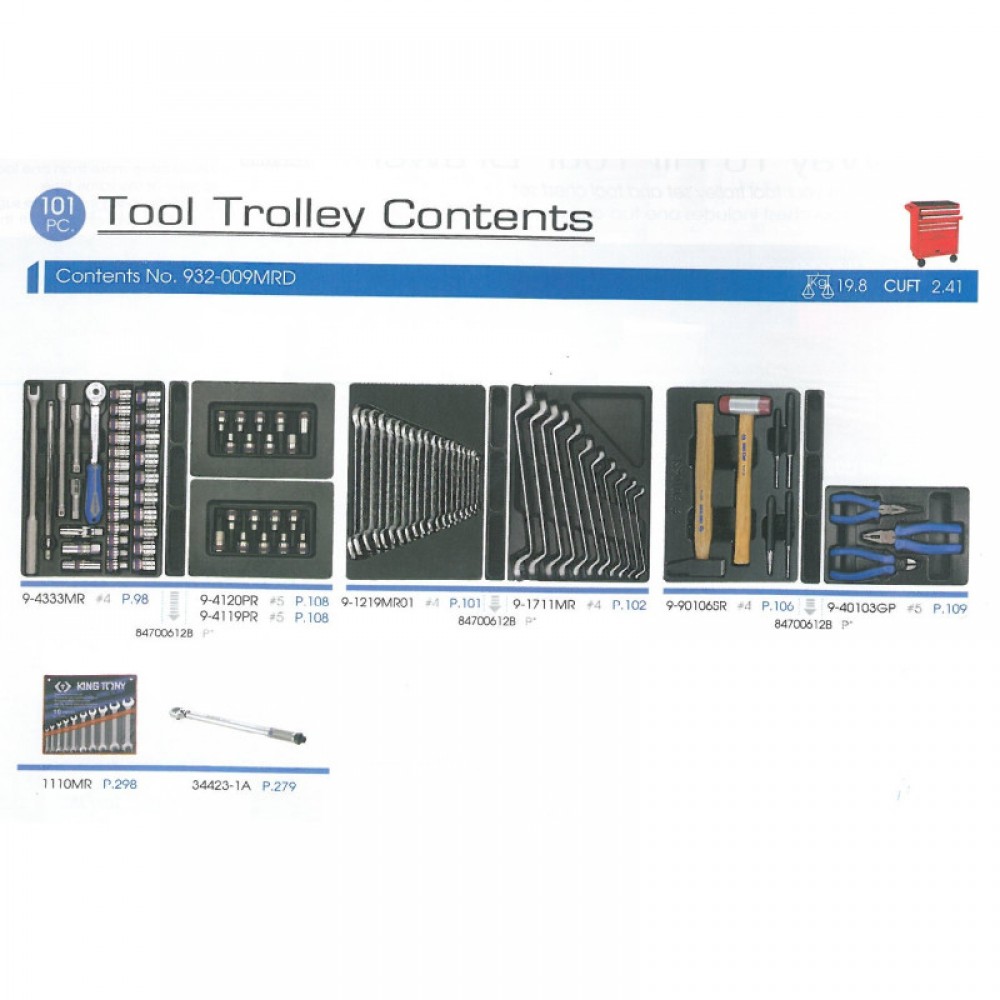 Універсальний набір інструменту для тумби KING TONY 932-009MRD, 173 предметів У набір входить: Набір торцевих головок 1/2" з приладдям, ложемент, 33 предмети Набір ударних головок 1/2" та торцевих головок 1/4" з приладдям, ложемент, 40 предметів Набір комбінованих ключів, ложемент, 16 предметів Набір накидних ключів, ложемент, 11 предметів Набір викруток, ложемент, 10 предметів Набір торцевих насадок, шестигранники Г-подібні та розрізні ключі, ложемент, 31 предмет Набір L-подібних ключів HEX, ложемент, 8 предметів Набір L-подібних ключів TORX, ложемент, 8 предметів Набір знімачів стопорних кілець, плоскогубців та бокорізів, ложемент, 7 предметів Набір переставні кліщі, розвідний ключ і молоток, ложемент, 3 предмети Набір виколоток, 6 предметів