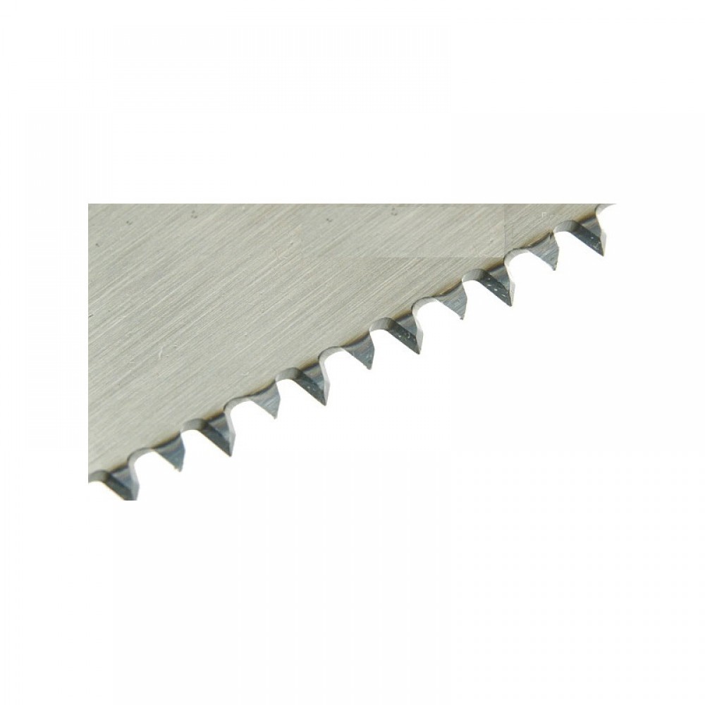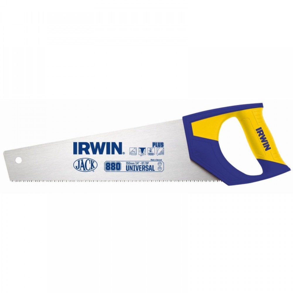 Ножівка по дереву 350мм 8T/9P універсальна Plus, IRWIN Призначена для пиляння заготовок з деревини м'яких та твердих порід, фанери, ДСП, ПХВ. Жорстке полотно товщиною 0,85 мм із високоякісної холоднокатаної сталі С75, для максимальної стабільності та передачі зусилля оператора. Зуби мають тригранну заточку, виконану за технологією TGT, це дозволяє виробляти пиляння, коли пила рухається не тільки вперед, а й назад. Оптимізоване розведення зубів для швидкого старту, чистого та прямолінійного різу Універсальний розмір і відстань зубів 8TPI/9Р дозволяє пиляти деревину як уздовж, так і поперек волокон, а також створює ефективне відведення для тирси. Лезо інструменту покрите антикорозійним лаком на водній основі, що в 4 рази надійніше і довговічніше, ніж традиційне покриття. Дуже зручна ергономічна ручка із двох матеріалів, приварена ультразвуком для надійної фіксації. Також ручка має збільшене коло рукоятки (гарантує ідеальне відчуття контролю в процесі різання) та оптимізований простір для рук, що надає більше комфорту для роботи в рукавичках. Рукоятка має грані для побудови кутів 90 і 45 для зручності при розмітці. Асортимент ножівок IRWIN ® Jack® є найкращими у своєму класі ручними пилками для сучасних професіоналів. Передова технологія зубів та ергономічна рукоятка ProTouch™ роблять ручні пилки IRWIN найкращим вибором для швидкості, простоти та якості різання.