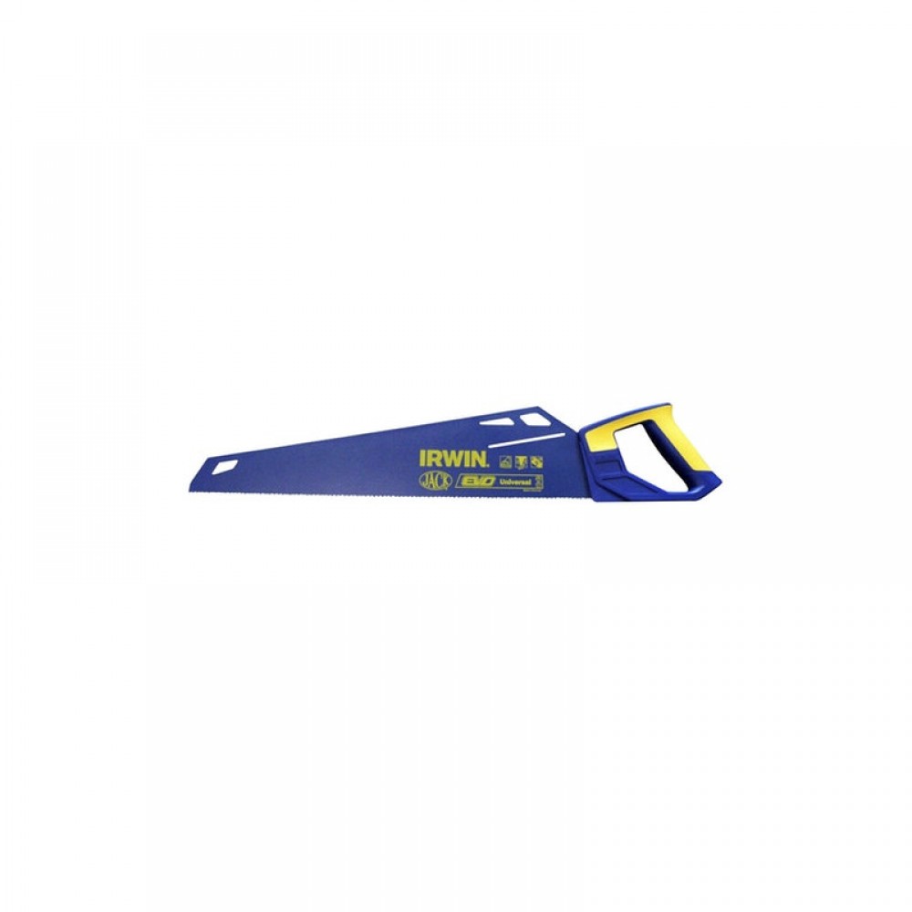 Ножівка по дереву EVO 490мм PTFE покриття, універсальна, IRWIN Призначена для пиляння заготовок з деревини м'яких та твердих порід, фанери, ДСП, ПХВ. Жорстке полотно товщиною 0,85 мм із високоякісної холоднокатаної сталі С75, для максимальної стабільності та передачі зусилля оператора. Зуби мають тригранну заточку, виконану за технологією TGT, це дозволяє виробляти пиляння, коли пила рухається не тільки вперед, а й назад. Оптимізоване розведення зубів для швидкого старту, чистого та прямолінійного різу Універсальний розмір і відстань зубів 8TPI/9Р дозволяє пиляти деревину як уздовж, так і поперек волокон, а також створює ефективне відведення для тирси. Великий кут передньої частини леза сприяє кращій стійкості полотна. Лезо інструменту має тефлонове покриття (PTFE). Така поверхня має менший опір до тертя і забезпечує на 20-50% вищу продуктивність пиляння (залежно від матеріалу). Унікальна рукоятка. Кут та низьке положення ручки призначені для значного підвищення продуктивності та зручності використання. Дозволяє природним чином використовувати всю довжину леза, що знижує кількість проходів і, отже, зусилля, що додаються. Дуже зручна ергономічна ручка із двох матеріалів, приварена ультразвуком для надійної фіксації. Також ручка має збільшене коло рукоятки (гарантує ідеальне відчуття контролю в процесі різання) та оптимізований простір для рук, що надає більше комфорту для роботи в рукавичках. Полотно ножівки має грані для побудови кутів 90 і 45 для зручності при розмітці. Асортимент ножівок IRWIN ® Jack® є найкращими у своєму класі ручними пилками для сучасних професіоналів. Передова технологія зубів та ергономічна рукоятка ProTouch™ роблять ручні пилки IRWIN найкращим вибором для швидкості, простоти та якості різання.