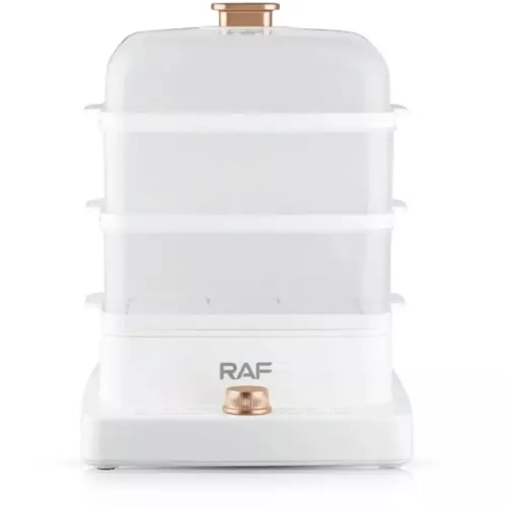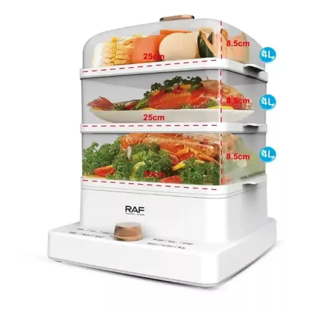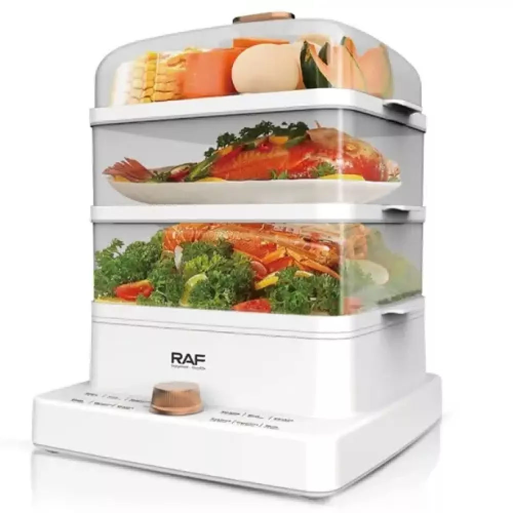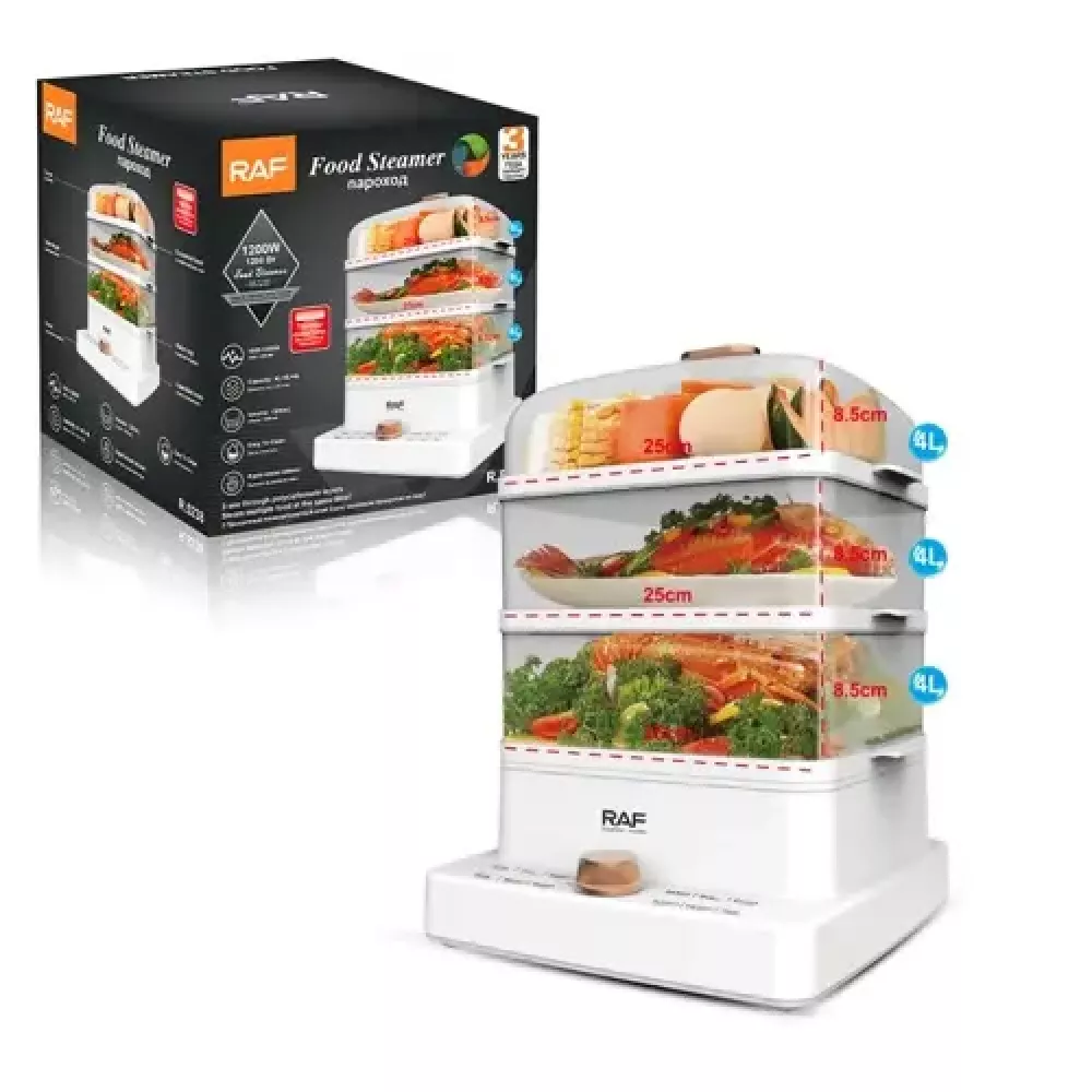 Портативна електрична пароварка RAF R.5238 містить 3 контейнери для їжі. Вона проста у використанні та легко піддається чищенню.