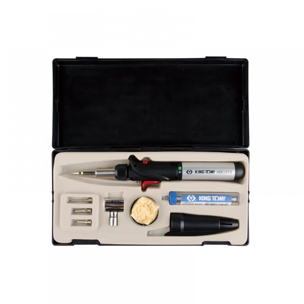 Газовий паяльник потужністю 150 Ватт із комплектом змінних насадок позиціонується як професійний інструмент для станцій ТО та підприємств. Однак, прилад знайшов застосування серед домашніх користувачів, яких зацікавив функціонал обладнання. Портативний газовий паяльник King Tony вміє видаляти лакофарбові покриття, запаювати, розплавляти, виконувати термічну усадку, випалювати та різати. Крім потужності, у пріоритеті у ручного інструменту надійність та довговічність. Виготовлений із високоміцної легованої сталі газовий паяльник бренду King Tony, супроводжується офіційною довічною гарантією. Для продовження терміну експлуатації продукту, виробник рекомендує використовувати лише оригінальні насадки та аксесуари. Комплектується газовий паяльник комфортабельним пеналом для зберігання та транспортування. Крім виробу, всередині кейсу, власник виявить захисний ковпачок з полум'ягасником для паяльника, контейнер з дротом з олова, насадки та контейнер для охолодження або чищення. Насадка для термічної усадки проводки є в комплекті. Для заправки паяльника газом розбирання інструменту не потрібне. На корпусі передбачено регулятор потужності подачі газу.