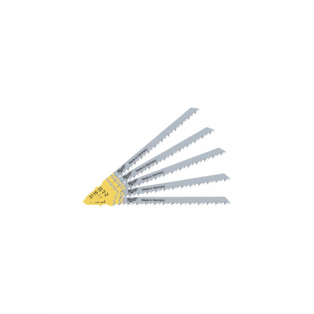 Полотна для лобзика T344D 105мм (5 шт) HCS - полотна для лобзиків із високовуглецевої сталі використовуються для різання всіх типів дерева та пластику. Заточування та агресивна геометрія зуба ідеально підходить для дуже швидкого різання деревини. Характеристики: Серія для швидкого різання Тип по дереву Грубий різ так Довжина леза (мм) 105 Кількість (шт) 5 Прямий різ немає Тип хвостовика T-подібний Фігурне різання немає Крок зубів (мм) 4 Швидкий рез так Матеріал полотна HCS Дерево (мм) ДСП (мм) немає ЛДСП (мм) немає Паркетний ламінат (мм) немає ПВХ (мм) немає Кухонні стільниці немає