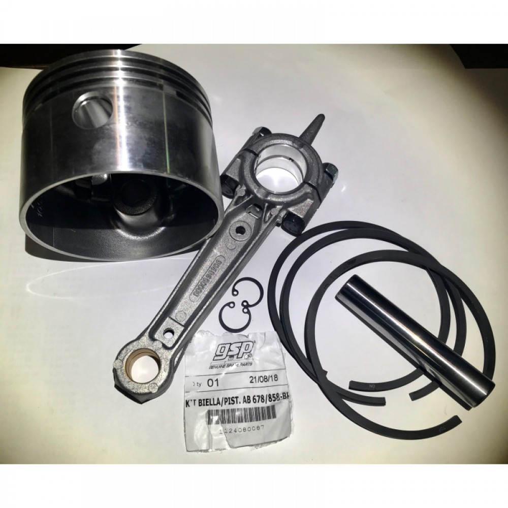 Поршень у зборі для AB 678/858 FIAC (1124080087) – це запасні частини для компресорного обладнання. Набір включає поршень, шатун, палець, кільця, елементи кріплення. Всі компоненти в збиранні ідеально підігнані один до одного. Тому виробник наполягає на повній заміні всіх елементів.