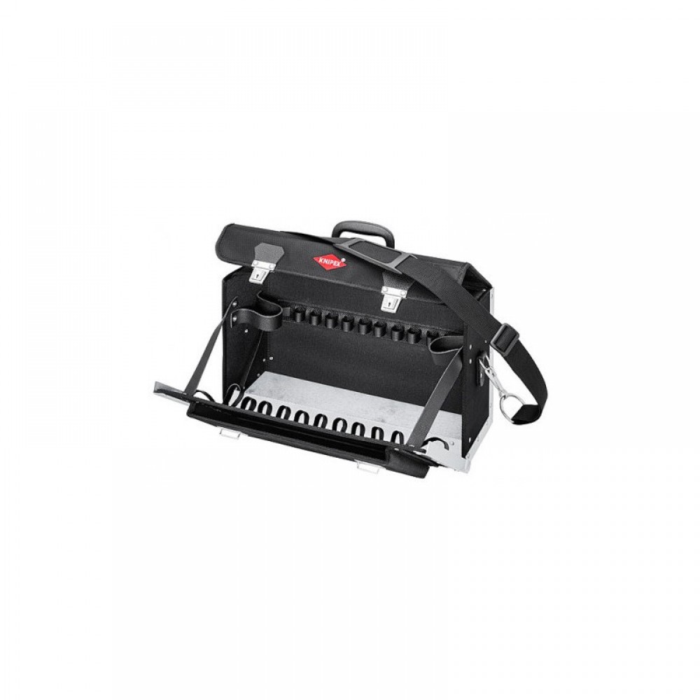 Портфель для інструментів "New Classic Basic" порожній, KNIPEX 00 21 02 LE легка конструкція з посиленого, зносостійкого поліестеру передня панель додатково посилена алюмінієвими куточками передня панель відкидається частково, з регульованими петлями та відділенням для документів із зовнішнього боку з оцинкованим піддоном з ручкою для перенесення та регульованим плечовим ременем без інструменту
