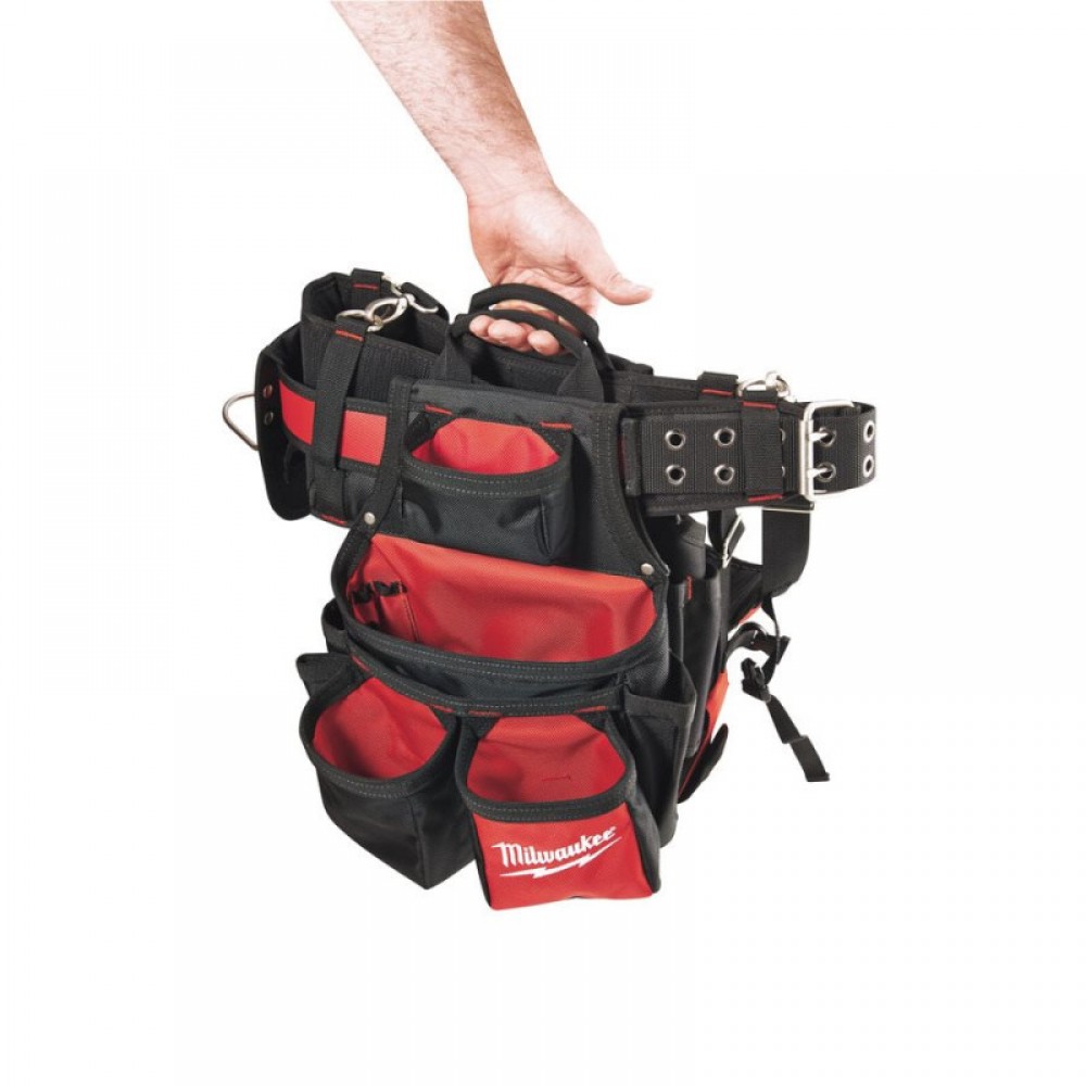 Виготовлено із балістичного нейлону 1680D для витримування умов будівельного майданчика. Подвійні шви посилені заклепками, міцніше у 4 рази. М'яка 4-х точкова підвіска розподіляє вагу для комфортної роботи весь день. М'який, дихаючий ремінь для максимального комфорту та продуктивності на робочому майданчику. Інтегровані в підсумки ручки дозволяють використовувати їх окремо від ременя і забезпечують зручність переміщення приладдя на робочому майданчику. Металеві скоби для кріплення підвіски. Металева кліпса для зберігання рулетки із швидким доступом до неї. Артикул 48228120 Кількість в упаковці 1 Комплект поставки: Робочий пояс - 1 шт Напоясна сумка велика - 2 шт. Підвіска - 1 шт