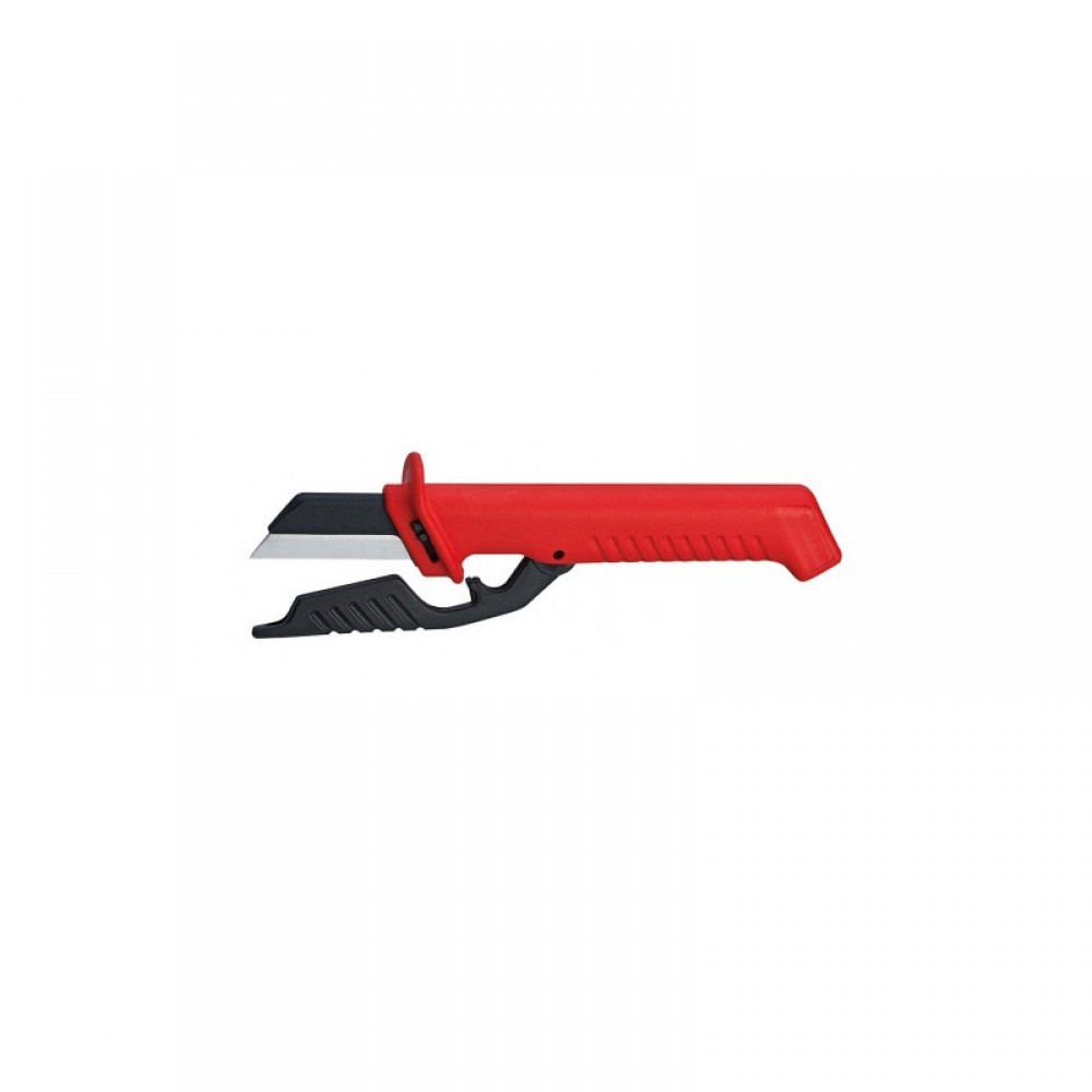 Різак для кабелів KNIPEX 98 56 Основні характеристики: лезо спеціально відшліфоване, змінне з відкидним чохлом для леза, вбудованим у ручку для запобігання можливості втрати обухи лез покриті пластмасою для попередження короткого замикання ручка із захистом від зісковзування долоні лезо: хірургічна сталь, нержавіюча, загартована на повітрі Короткі характеристики Довжина леза 50 мм Довжина загальна 190 mm Вага нетто 64 g