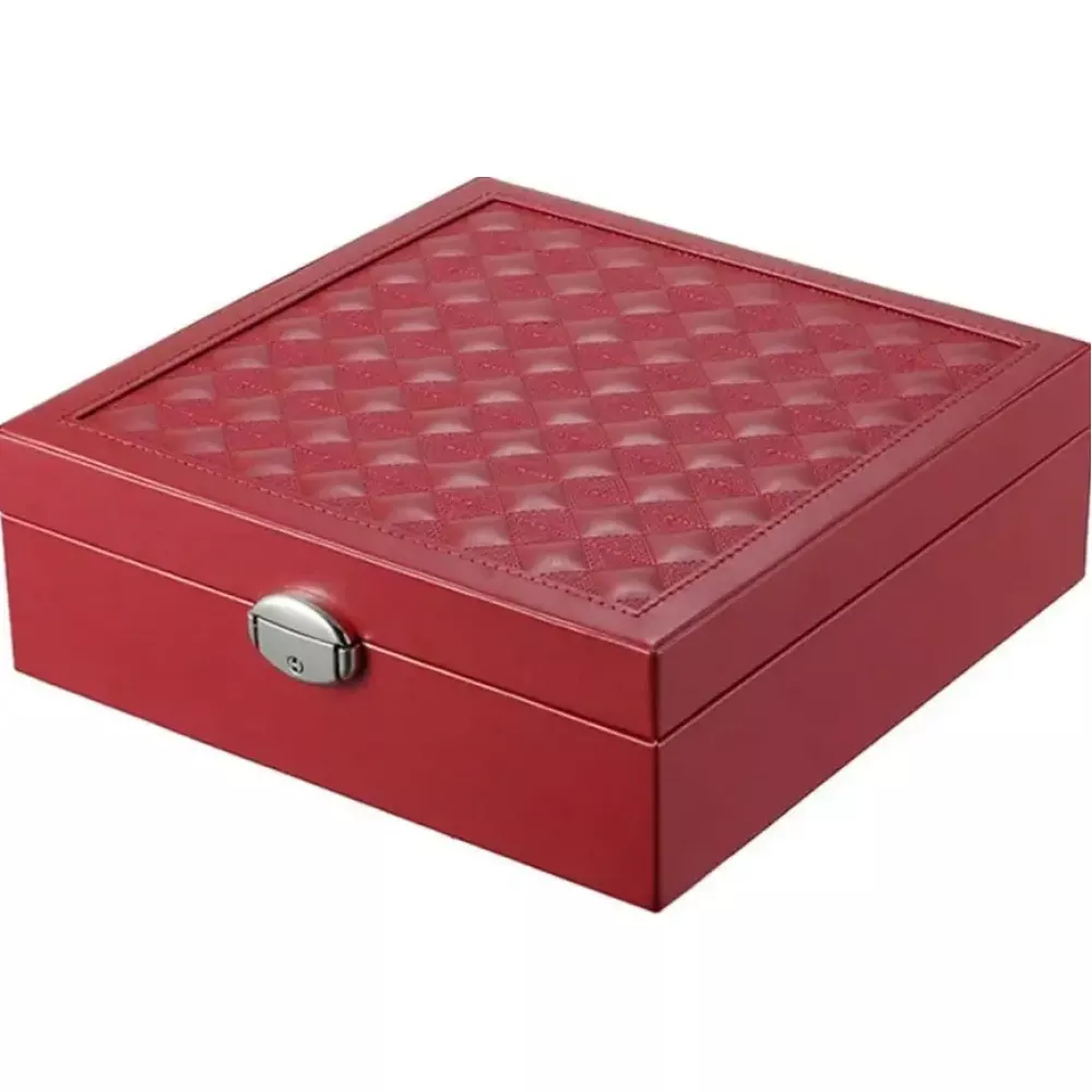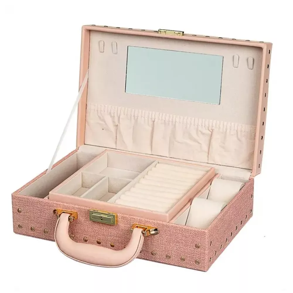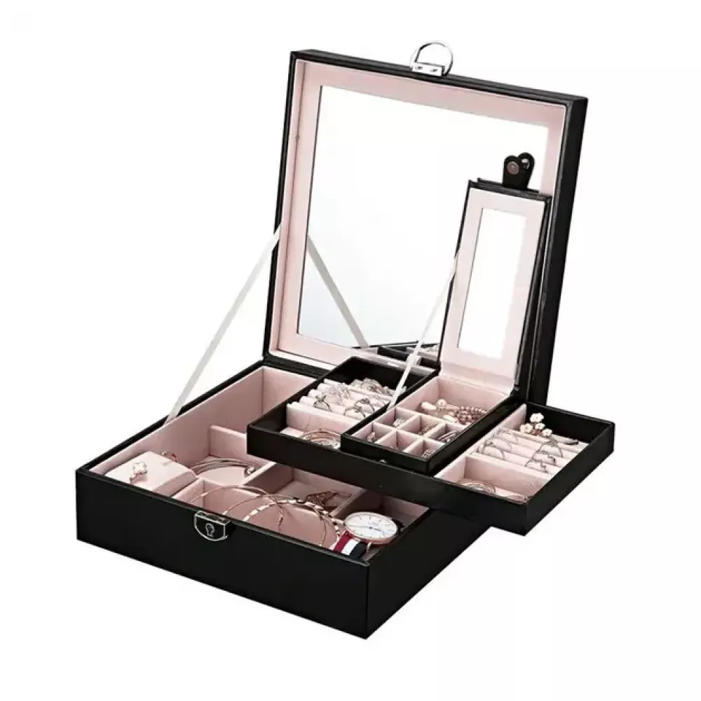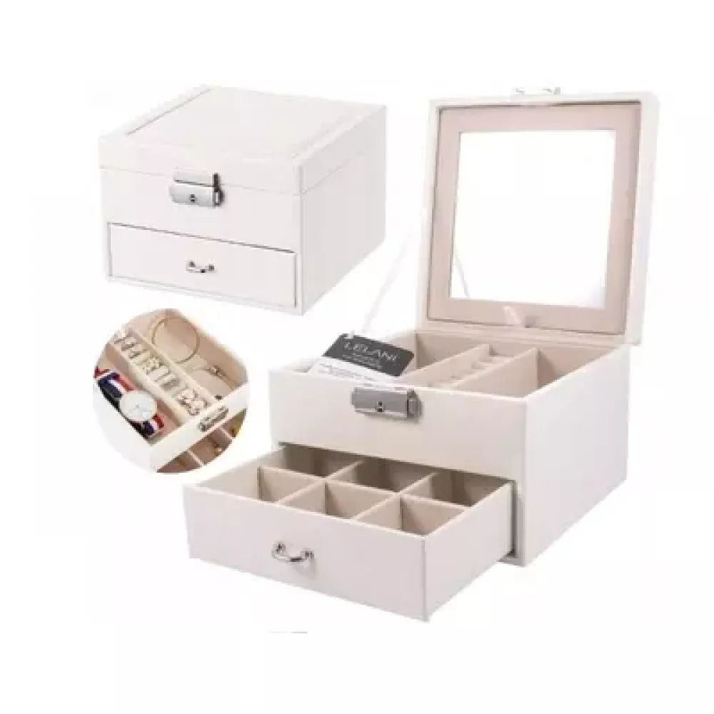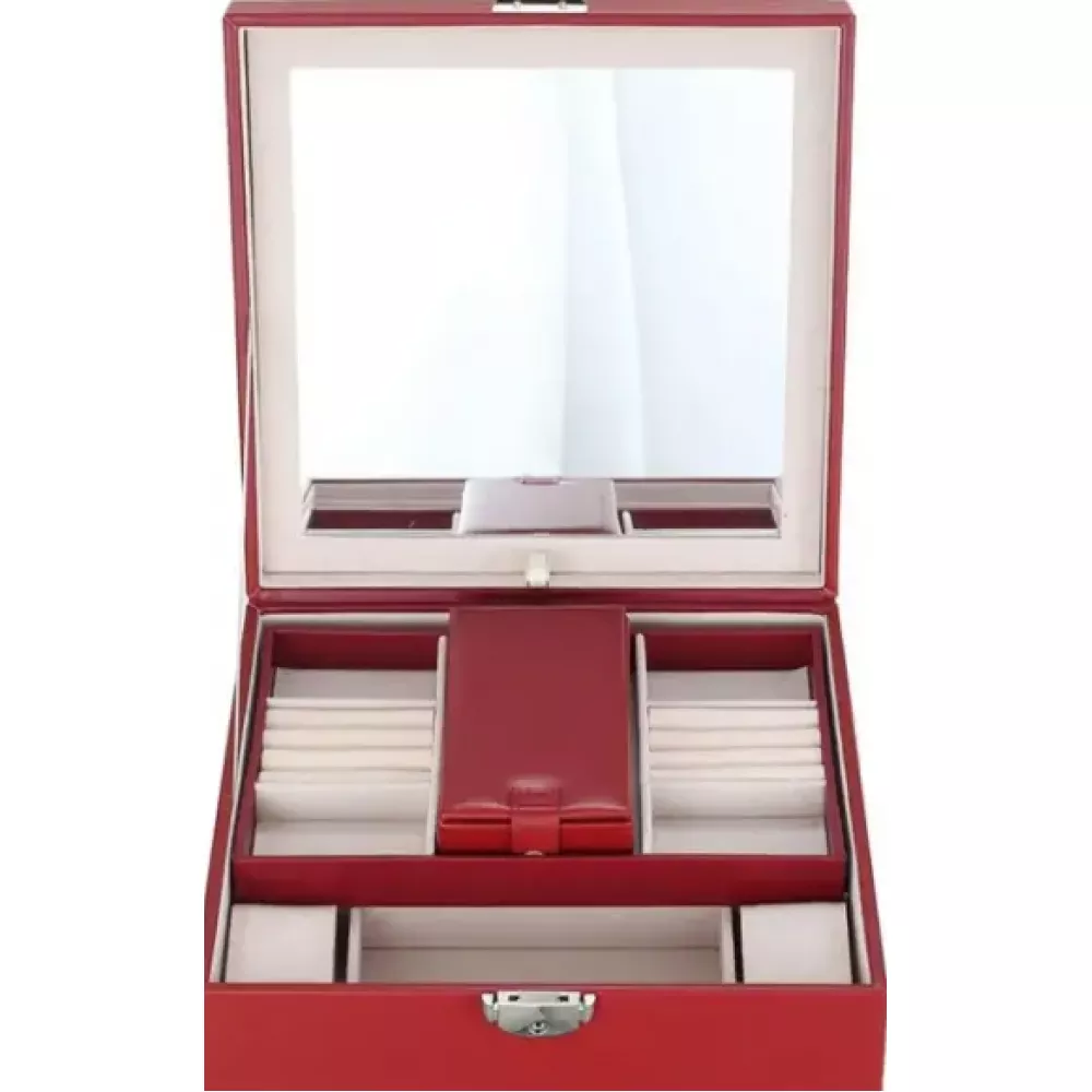 Дуже функціональна та елегантна скринька для прикрас та годинників. Особливості продукту: - Виготовляється із стьобаної еко-шкіри найвищої якості, внутрішнє оздоблення – Велюр - Велика, дуже функціональна і продумана до дрібниць - Замикається на металевий замок з ключем - Скринька має 2 рівні з відділення для зберігання: кілець, сережок, намист та багато іншого. Верхній знімний рівень, крім того, в ній є окрема знімна коробка для найдорожчих цінностей, яку зручно взяти з собою. - Висувне дзеркало - за його допомогою ви легко зможете зробити макіяж та одягнути улюблені прикраси - Скринька ідеально підходить для подарунка!