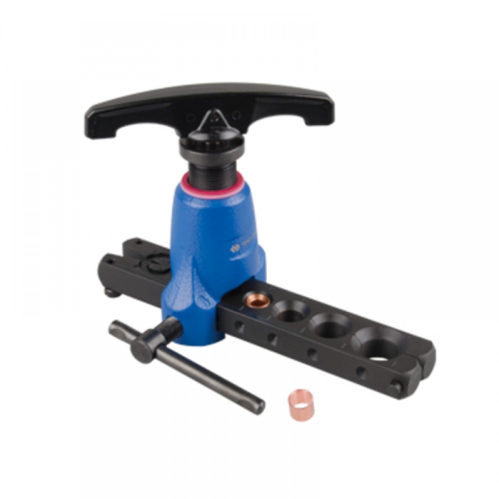 Купити струбцину для розвальцювання труб в автосервісі Особливість обладнання у роботі лише з виробами із кольорових металів. Зручно працювати з алюмінієм, міддю, латунню та іншими металами, що мають м'яку основу. Для зручності використання в комплекті поставляються плашки під розміри труб: 1/4", 5/16", 3/8", 5/8", 3/4". Ексцентрики мають кут 45 градусів. Матеріал виготовлення механізму, що розвальцьовує - високовуглецева сталь. Решта елементів конструкції виготовлені з алюмінієвого сплаву. Щоб не зламати трубку, передбачена розвантажувальна пружина. Працювати зі струбциною дуже просто, але для експлуатації потрібний невеликий досвід.