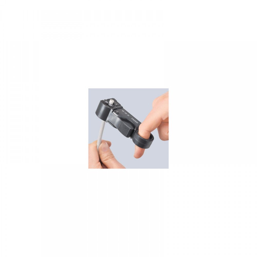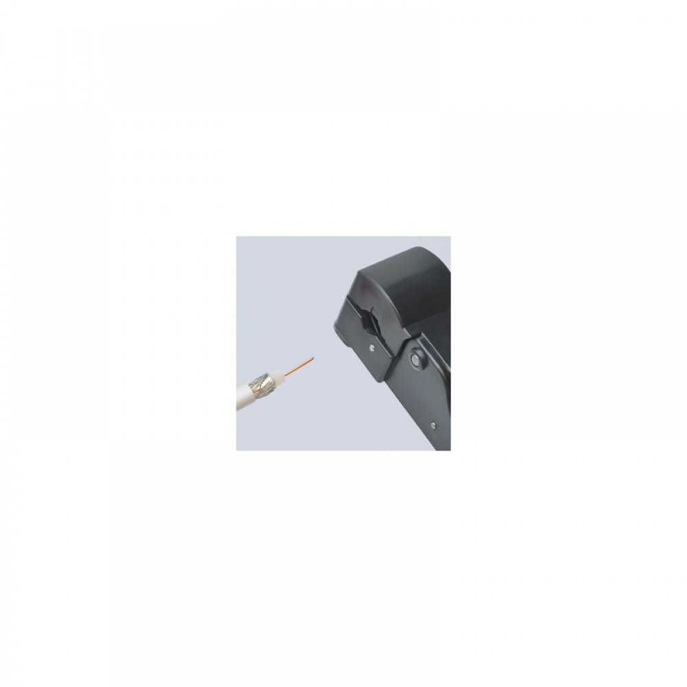 Інструмент для видалення ізоляції з коаксильних кабелів KNIPEX 16 60 05 SB для видалення ізоляції з коаксіального кабелю (RG 58, RG 59 та RG 62) для видалення зовнішньої оболонки, екрану та ізоляції за один робочий хід з трьома вбудованими ножами глибина різу може налаштовуватися для кожного ножа окремо за допомогою шестигранного ключа положення ножа не змінюється корпус: пластик протиударний