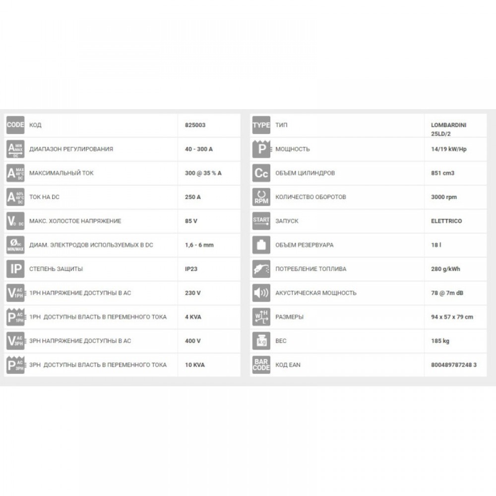 Дизельний приводний зварювальний апарат (двигун LOMBARDINI) для зварювання постійним струмом електродами MMA. Можливість використання з різними типами електродів: рутиловими, лужними, целюлозними, нержавіючої сталі, алюмінію, чавуну і т.д. Може використовуватися як однофазний і трифазний генератор змінного струму для живлення всіх типів електроінструментів (наприклад: шліфувальних верстатів, дрилів, перфораторів, відбійних молотків і т.д.), компресорів, систем неонового освітлення і ламп розжарювання і т.д. Характеристики: - 4-тактний двоциліндровий дизельний двигун з безпосереднім упорскуванням та повітряним охолодженням - електростартерний запуск від ключа запалювання - три діапазони регулювання струму зварювання - трифазна розетка 10,0 кВА та однофазна розетка 4,0 кВА із захистом - термостатичний захист - звітності при низькому тиску олії - бак із сигналізатором рівня.