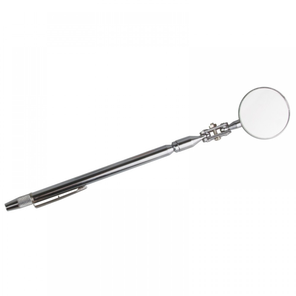 Телескопічне дзеркало (з магнітом) – це пристрій для огляду прихованих або важкодоступних місць: автомобіля, вузлів чи механізмів. Телескопічна конструкція, подвійне шарнірне з'єднання, поворотне дзеркало на 360 градусів. Рукоятка інструменту намагнічена і виконана у вигляді кулькової ручки з відповідним кріпленням (кліпса). Наконечник рукоятки телескопічного дзеркала, що знімається – під ним тонкий металевий маркер для нанесення розмітки на твердих поверхнях. Виробник: King Tony Країна виробник: Тайвань Матеріал: сталь Оздоблення: хромування, полірування Дзеркало: поворотне, кругле, діаметр – 38 мм Сила магніту: 1.3 lbs/ 0,6 кг Розмір: максимальна довжина 635 мм Вага: 87 грам Кількість телескопічних дзеркал в упаковці – 50, ящик – 100 штук.