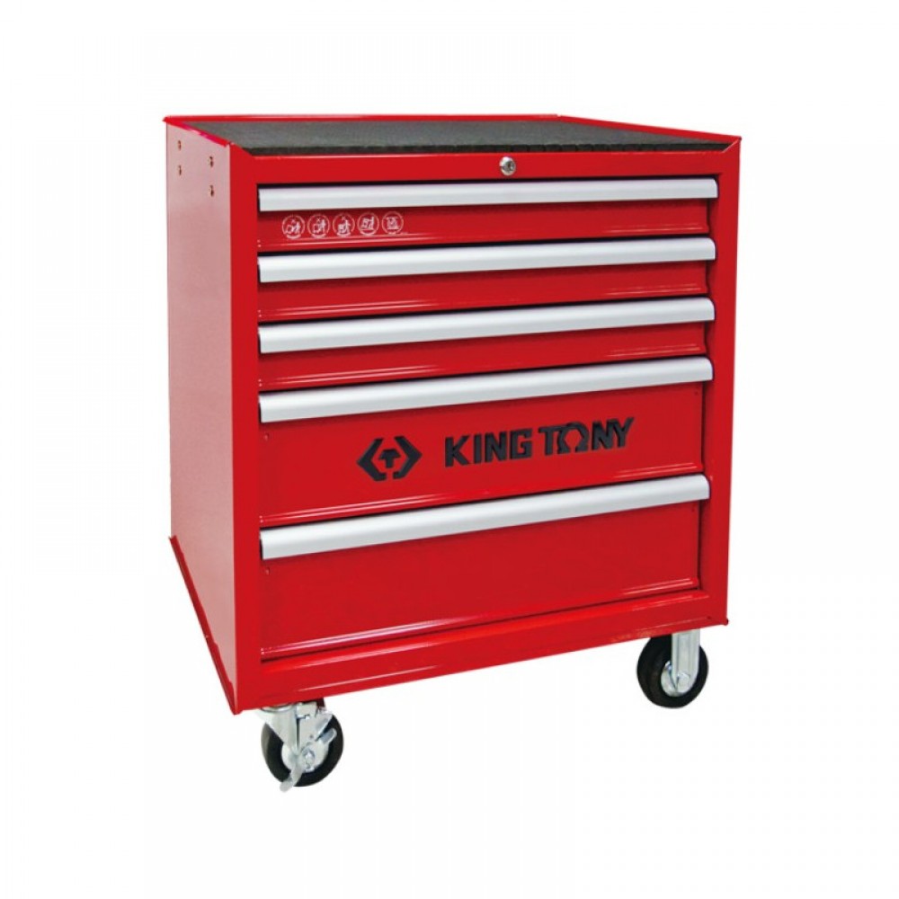Тумба інструментальна під верстат 5 полична King Tony (87431-5BE) – це система зберігання інструменту в мобільному виконанні. Конструкція зручна для обслуговування автомобілів у автосервісі. Завдяки відмінній функціональності, користується попитом у промисловості та будівництві. Особливості інструментальної тумби Кінг Тоні 87431-5BE Головна перевага тумби у підвищеній жорсткості конструкції. Завдяки цьому виріб можна використовувати в ролі верстата. Мобільна конструкція вільно витримає проведення простих слюсарних операцій. На окрему увагу заслуговують висувні полиці. Завдяки наявності підшипників вони легко висуваються, а напрямні усувають перекіс ящика при великій завантаженості. Усередині кожної полиці є гумовий килимок для захисту корпусу від подряпин та відколів. За безпеку відповідає центральний замок – блокування виконується одночасно для всіх ящиків, якщо вони зачинені. Матеріалом виготовлення мобільної тумби служить листова сталь. Конструкція зварювальна. Зовні та зсередини тумба пофарбована захисним шаром порошкової фарби. Колеса металеві, посилені, з поліуретановим покриттям. Є блокування колісної пари.