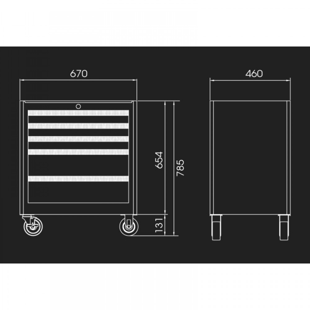 · Габарити тумби 670х785х460 мм (з висотою коліс 131 мм).· 3 висувні ящики: 576х380х75 мм, вантажопідйомність 25 кг.· 2 висувні ящики: 576х380х154 мм, вантажопідйомність 30 кг.· Граничне статичне навантаження на конструкцію – 250 кг. · Вага тумби з ящиками без інструмента – 50 кг.