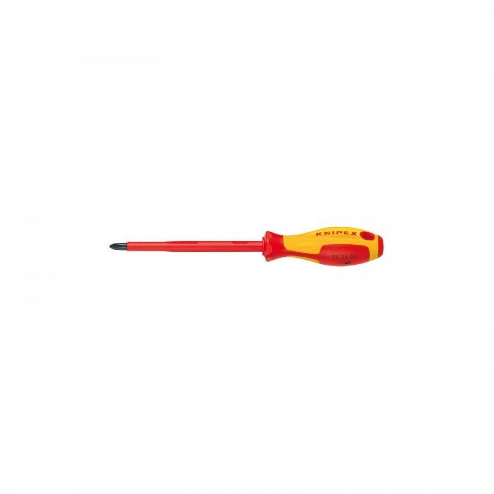 Викрутка для гвинтів із хрестовим шліцем Phillips KNIPEX 98 24 03 Діаметр наконечника 8 мм Довжина леза 150 мм Довжина леза неізольована 18 мм Довжина ручки 120 мм Розмір наконечника PH 3 Довжина загальна 270 mm Вага нетто 165 g