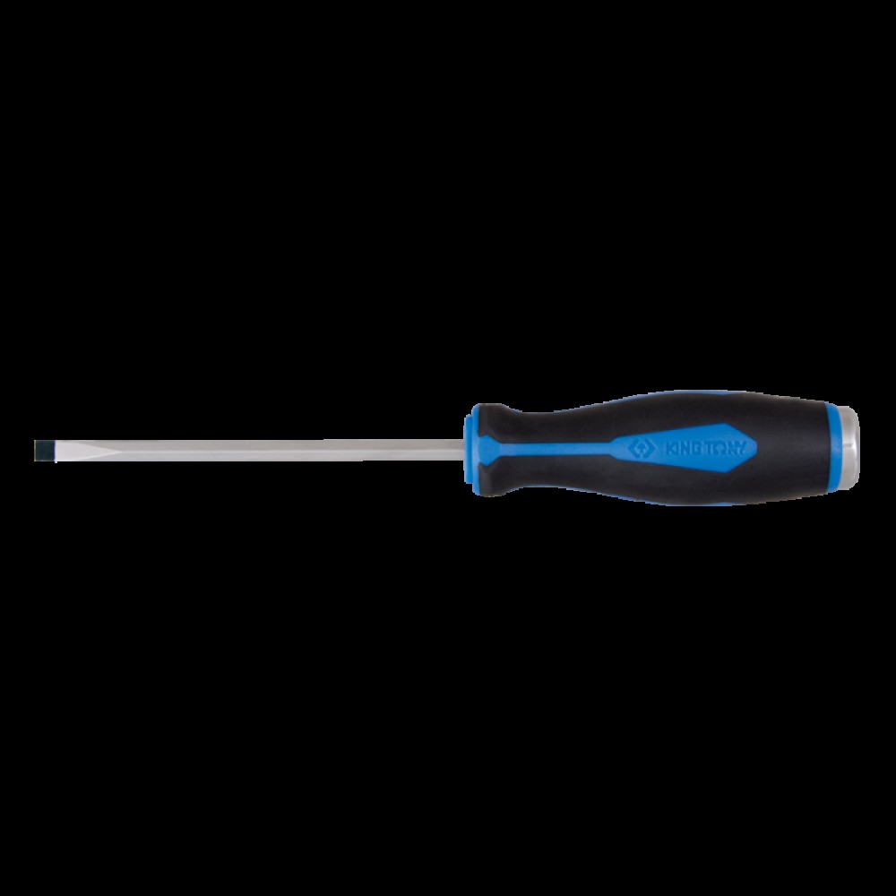 Викрутка силова шліцева 1.2 *8*175MM – слюсарний інструмент для роботи з різьбовими з'єднаннями. Використовується для відкручування або закручування болтів, саморізів, гвинтів та шурупів із прямим шліцом. Перевага силової викрутки у граненому стрижні. Використовуючи підручний інструмент, легко посилювати момент, що крутить, переданий кріпленню. Слюсарний інструмент ідеальний для автосервісу, де треба розібрати кріплення, що прикипіло або заржавіло. Виробник: King Tony Країна виробник: Тайвань Матеріал стрижня: легована інструментальна сталь (хром, ванадій) Матеріал хвостовика: легована сталь (хром, нікель, молібден) Оздоблення: хромування з чорним шліцем Рукоятка: поліпропілен + термопластична гума, металева п'ята Намагнічений наконечник: так Робочий профіль: шліць (slotted) Товщина шліцю: 1,2 мм Ширина шліцю: 8 мм Розмір: довжина стрижня 170 мм