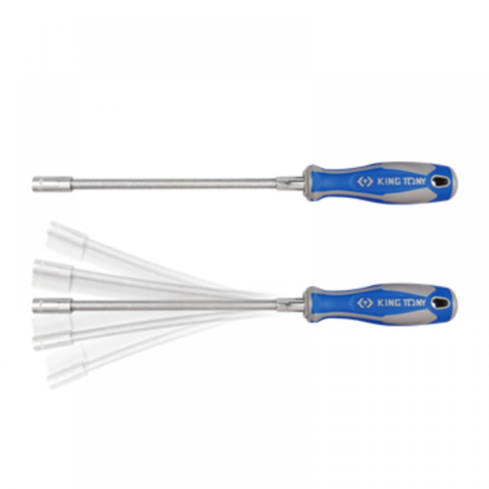 Викрутка торцева 6 мм, 300 мм, гнучка, для хомутів KING TONY 1453-08. Викрутка призначена для роботи з кріпильними хомутами, що фіксують різні патрубки, наприклад, патрубки системи охолодження автомобіля. Гнучкий шток викрутки дозволяє використовувати їх у місцях з обмеженим доступом до кріплення. Матеріал рукоятки PP + TPR – поліпропілен + термопластична гума, стійкий до розчинників та дії високих температур. Ергономічна форма рукоятки із пластику зручна при утриманні інструменту в процесі роботи. Технічні характеристики Розмір: 6 мм Довжина гнучкого стрижня: 190 мм Загальна довжина: 300 мм
