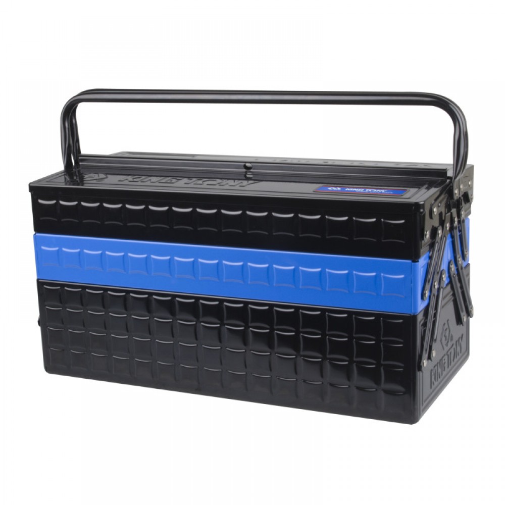 Скринька переносна для інструменту металева синя 470x220x260mm – це класичний саквояж для зберігання та транспортування професійного ручного інструменту та оснащення. Виріб призначений для автосервісу, але має попит у автолюбителів і будівельників. Металева конструкція саквояжного типу передбачає розсувний механізм із контейнерами для зберігання інструменту або деталей. Тобто, при відкритті, переносний ящик перетворюється на стелаж, де весь інструмент розкладений по своїх поличках. Таке рішення полегшує пошук ключів, викруток та інших аксесуарів для роботи слюсаря. Жорсткості металевої конструкції достатньо, щоб витримати фізичні ушкодження. При падінні розкладений по поличках ручний інструмент не перемішається. Скринька переносна для інструменту виготовлена з легованої сталі і покрита захисним шаром фарби, що виключає утворення іржі або подряпин. Округла рукоятка приємна на дотик і додає комфортабельності при перенесенні. Один ярус полиць пофарбований у синій колір для зручності пошуку інструменту, що зберігається. На верхніх стулках ящика є два поєднані отвори, призначені для встановлення навісного замка.