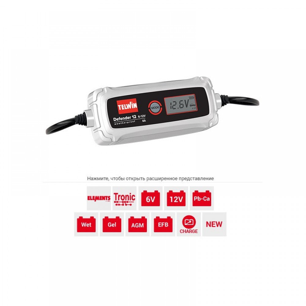 Зарядний пристрій Telwin DEFENDER 12 6V/12V DEFENDER 12 6V/12V kод 807607 Електронний зарядний пристрій з функцією підтримки заряду для акумуляторів типу WET, GEL, AGM, MF, PbCa, EFB, напругою 6/12 В. Спеціально розроблені програми заряджання для мотоциклів або автомобілів. Удосконалена функція заряджання та підтримання заряду акумуляторів в умовах низької температури. Характеристики: - Автоматична зарядка та підтримання заряду в режимі Tronic; - 3 напруги зарядки; - функція COLD для заряджання та підтримки заряду акумуляторів в умовах низької температури; - РК-екран; - стійкий до пилу, вологості та води; - Захист від перевантаження, короткого замикання та неправильної полярності. У комплект включений кабель із затискачами.