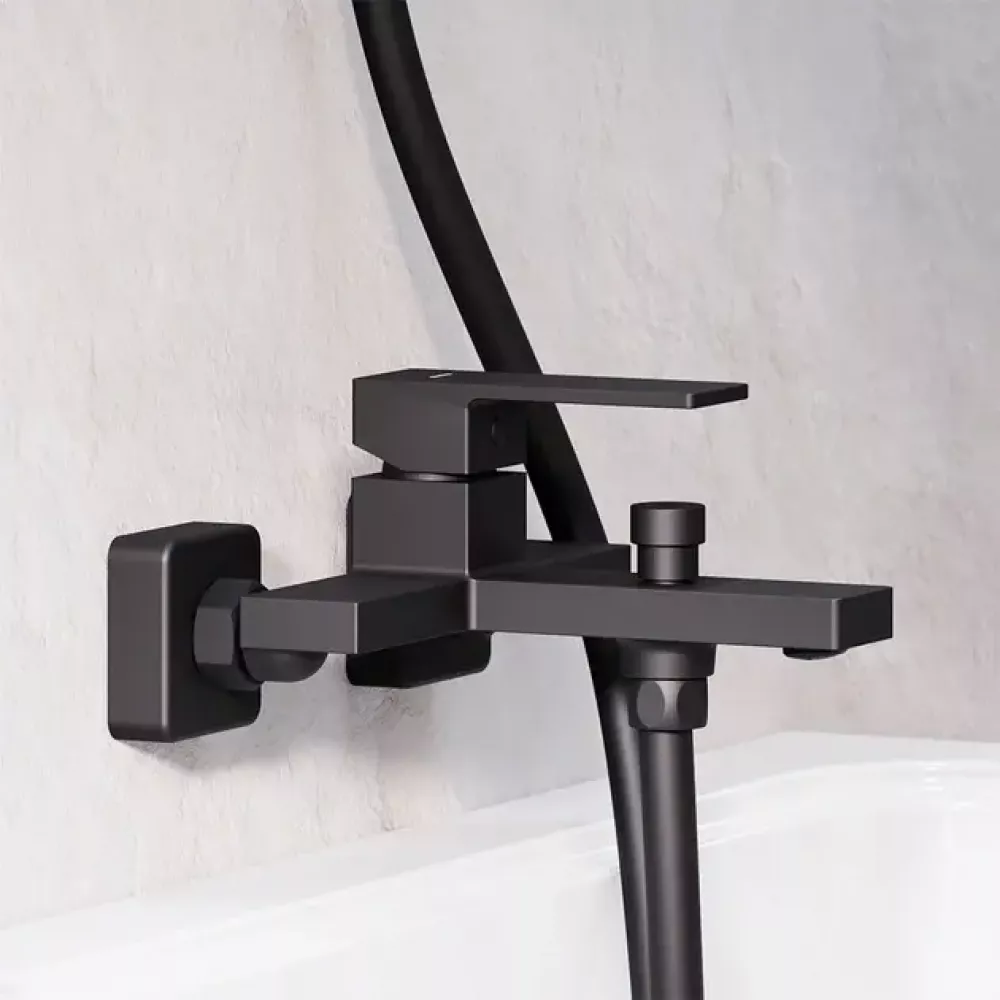 Сучасний настінний змішувач для ванної поєднує стильний мінімалістичний дизайн та надійну функціональність. Лаконічні геометричні форми та чорне матове покриття роблять модель ідеальним вибором для сучасних інтер'єрів у стилі лофт, мінімалізм чи хай-тек.