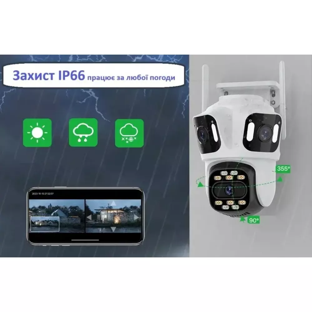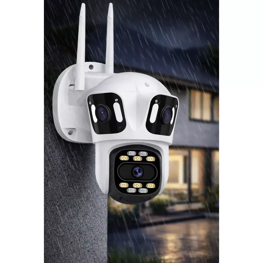Благодаря 3 объективам (все 3 независимые) она может выполнять функцию трех камер и одновременно вести наблюдение за тремя секторами, таким образом заменяя 3 камеры. Верхний объектив расположен на неподвижной основе, нижние 2 объектива на поворотной.