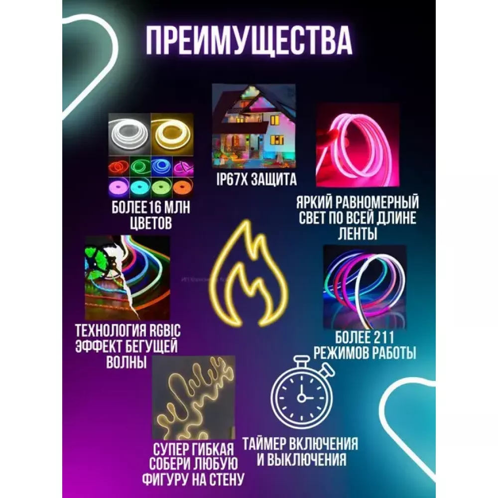 Эта неоновая лента представляет собой супер решение для создания атмосферы. Управлять лентой можно с помощью телефона или пульта (в комплекте). Данная модель имеет возможность выбора любого цвета из более 16 млн. возможных вариантов. Лента можно сгибать и фиксировать в любом положении, что позволяет создавать любые фигуры, надписи, композиции.