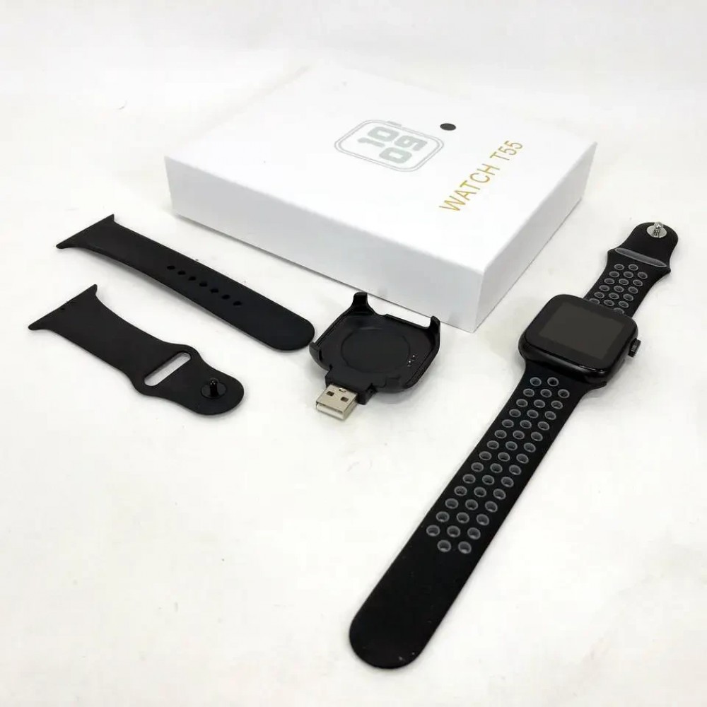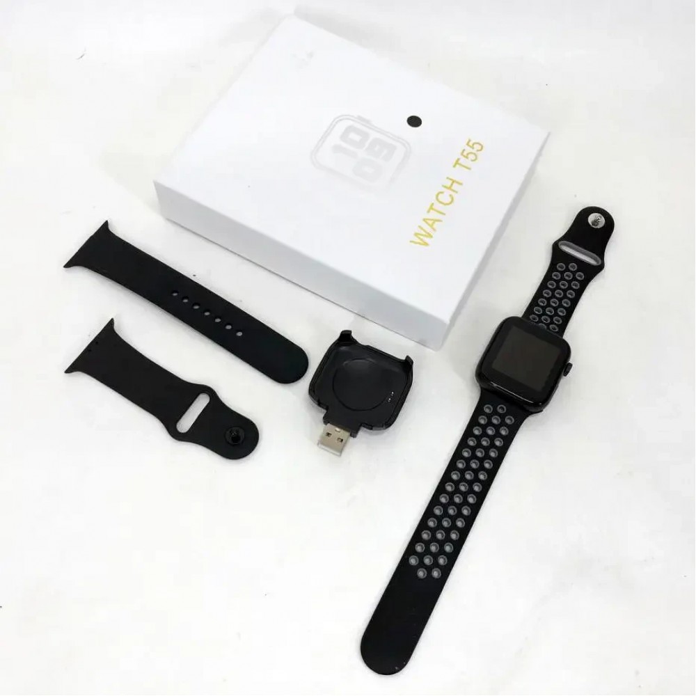 Умные часы Smart Watch T55. Часы имеют несколько видоизменный доработанный корпус. В смарт часы Т55 добавлены новые дисплеи, которые выглядят. Также в T55 изменены в лучшую сторону меню и возможности управления смарт часами. Радует и комплектация гаджета: в комплект входят сразу два силиконовых ремешка. Коробка гаджета также стала более презентабельной.