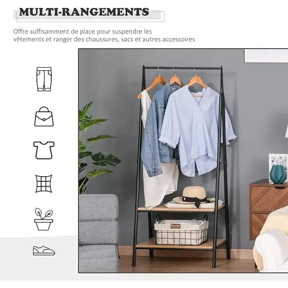 Прочная вешалка для одежды с грузоподъемностью 10 кг обеспечивает надежную опору для развешивания пальто, сумок и шляп. Два отделения идеально подходят для организации обуви, одежды и других вещей, каждая полка выдерживает нагрузку до 15 кг. Прочная конструкция из черных толстых труб и водонепроницаемых панелей МДФ гарантирует долговечность вешалки и ее устойчивость к ежедневному использованию.