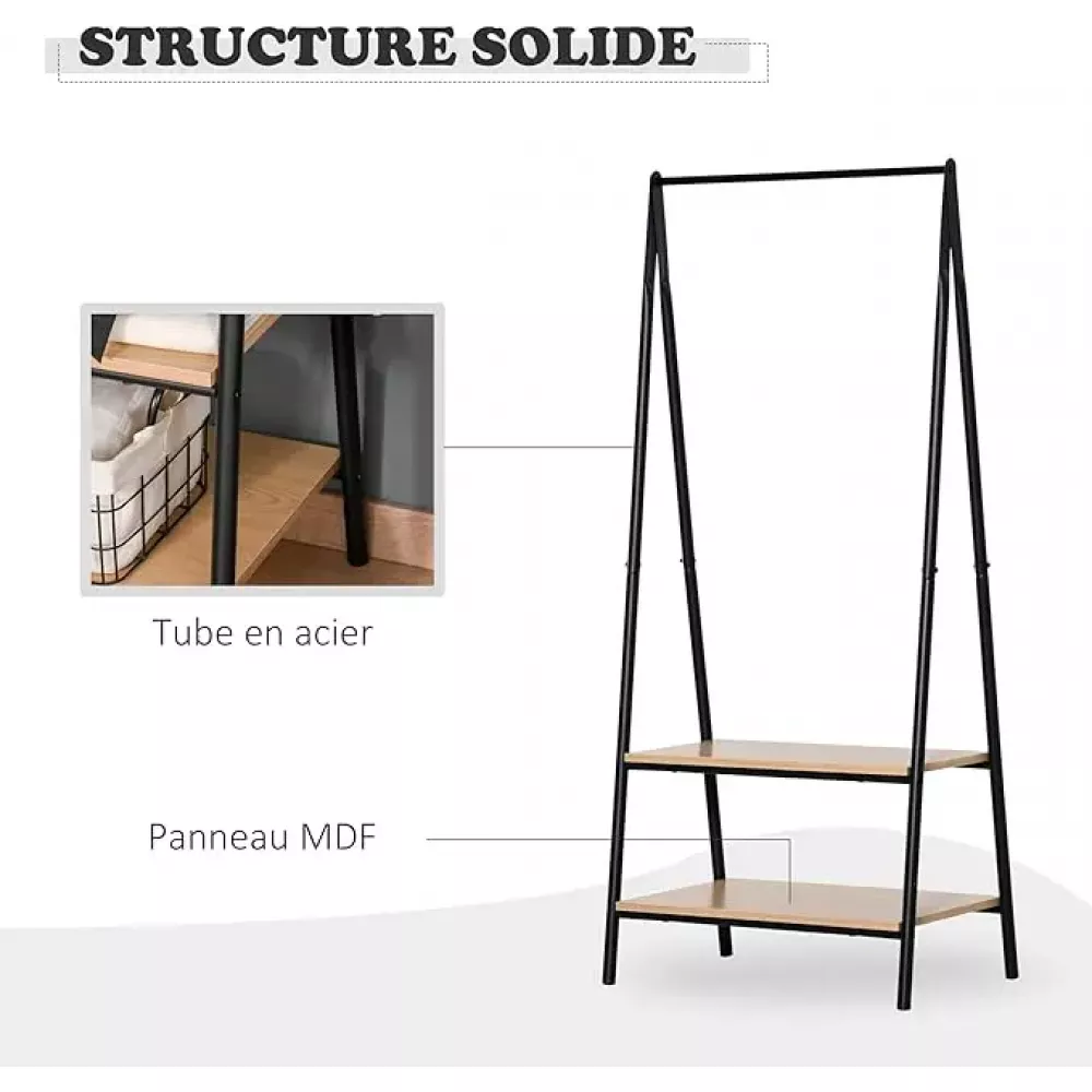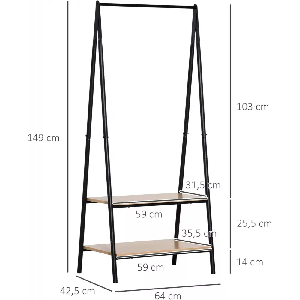 Эта напольная вешалка предлагает не только достаточно места для развешивания одежды, но и удобные полки для хранения обуви и других аксессуаров. Изготовленная из высококачественного металла и МДФ с черными стальными трубами и светлыми дубовыми отделениями для хранения, эта модель сочетает в себе прочность и современный внешний вид. Размеры примерно 151x60x40 см и общая высота 151 см обеспечивают достаточное место для хранения всего необходимого.