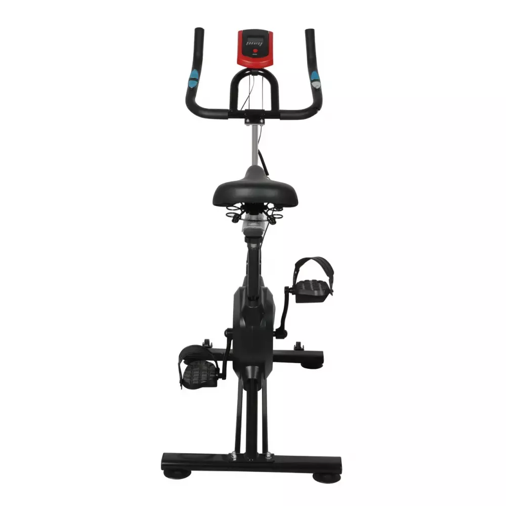 Спинбайк оснащен скользящей педалями с фиксаторами и аварийным тормозом.