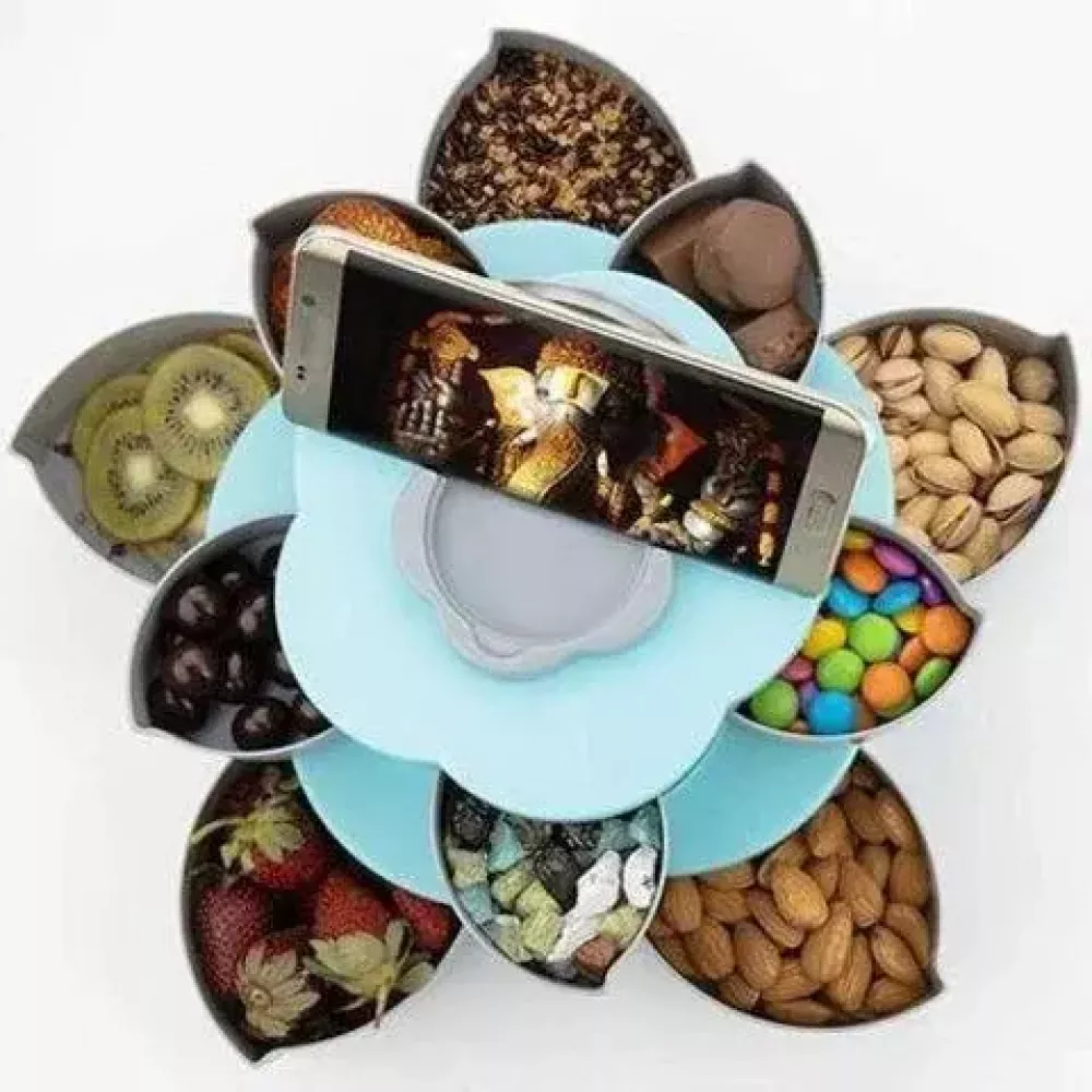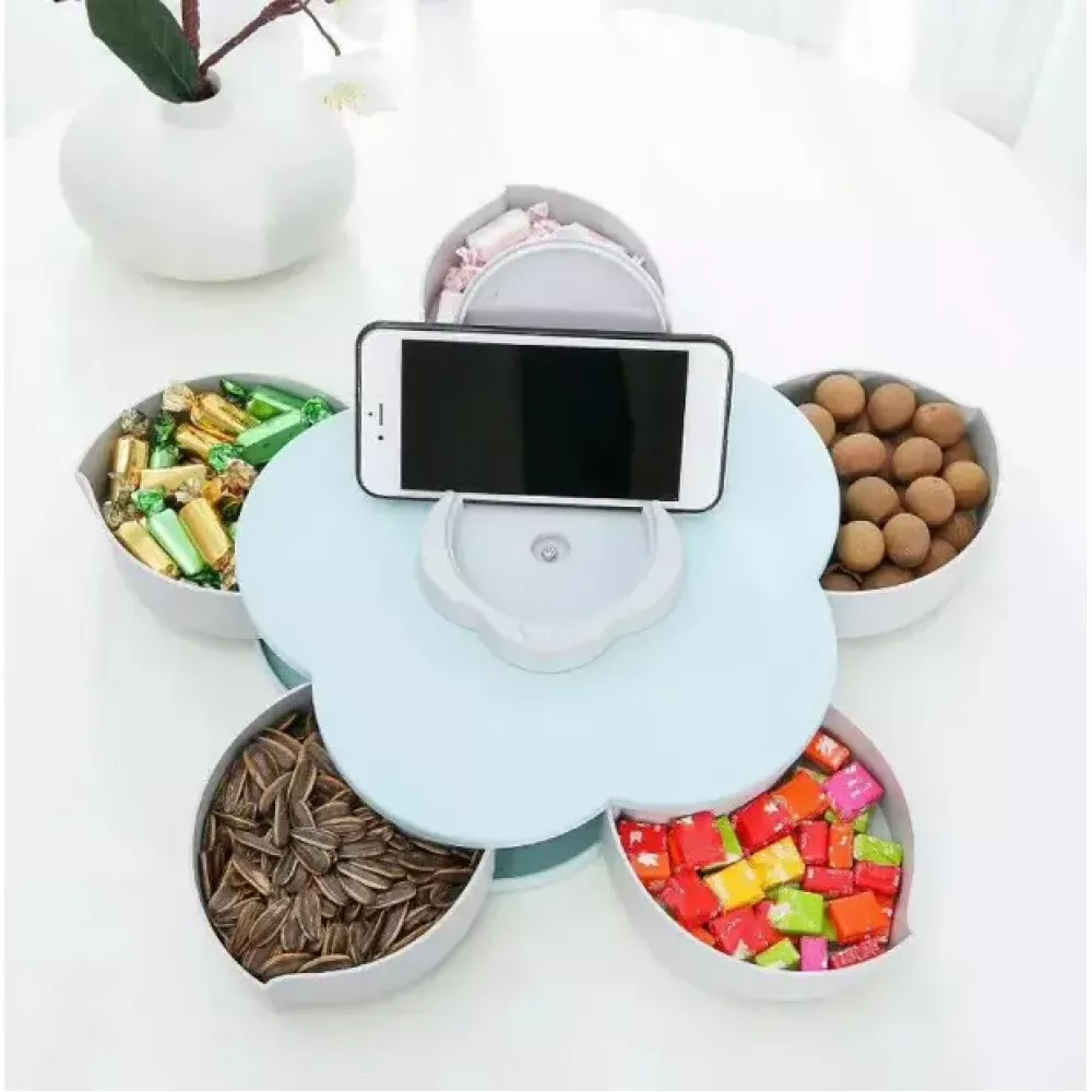 Тарелка оснащена десятью отделениями, которые располагаются на удобной вращающейся платформе, ее можно использовать в качестве блюда для снэков - просто раскройте лепестки и каждый сможет выбрать для себя самое вкусное лакомство. Она станет превосходным украшением любого праздничного мероприятия. Выполнена в приятных спокойных цветах, она прекрасно впишется в современный интерьер и станет отличным подарком для родных и близких. На верхней панели тарелки располагается держатель для мобильного телефона, поставьте тарелку на столик в гостиной и наслаждайтесь просмотром видео или чтением, лакомясь любимыми снэками