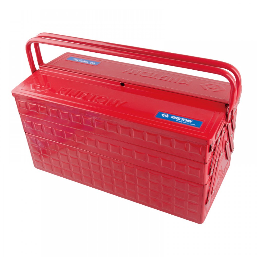 Скринька переносна для інструменту металева синя 470x220x260mm – це класичний саквояж для зберігання та транспортування професійного ручного інструменту та оснащення. Виріб призначений для автосервісу, але має попит у автолюбителів і будівельників. Металева конструкція саквояжного типу передбачає розсувний механізм із контейнерами для зберігання інструменту або деталей. Тобто, при відкритті, переносний ящик перетворюється на стелаж, де весь інструмент розкладений по своїх поличках. Таке рішення полегшує пошук ключів, викруток та інших аксесуарів для роботи слюсаря. Жорсткості металевої конструкції достатньо, щоб витримати фізичні ушкодження. При падінні розкладений по поличках ручний інструмент не перемішається. Скринька переносна для інструменту виготовлена з легованої сталі і покрита захисним шаром фарби, що виключає утворення іржі або подряпин. Округла рукоятка приємна на дотик і додає комфортабельності при перенесенні. Один ярус полиць пофарбований у синій колір для зручності пошуку інструменту, що зберігається. На верхніх стулках ящика є два поєднані отвори, призначені для встановлення навісного замка.
